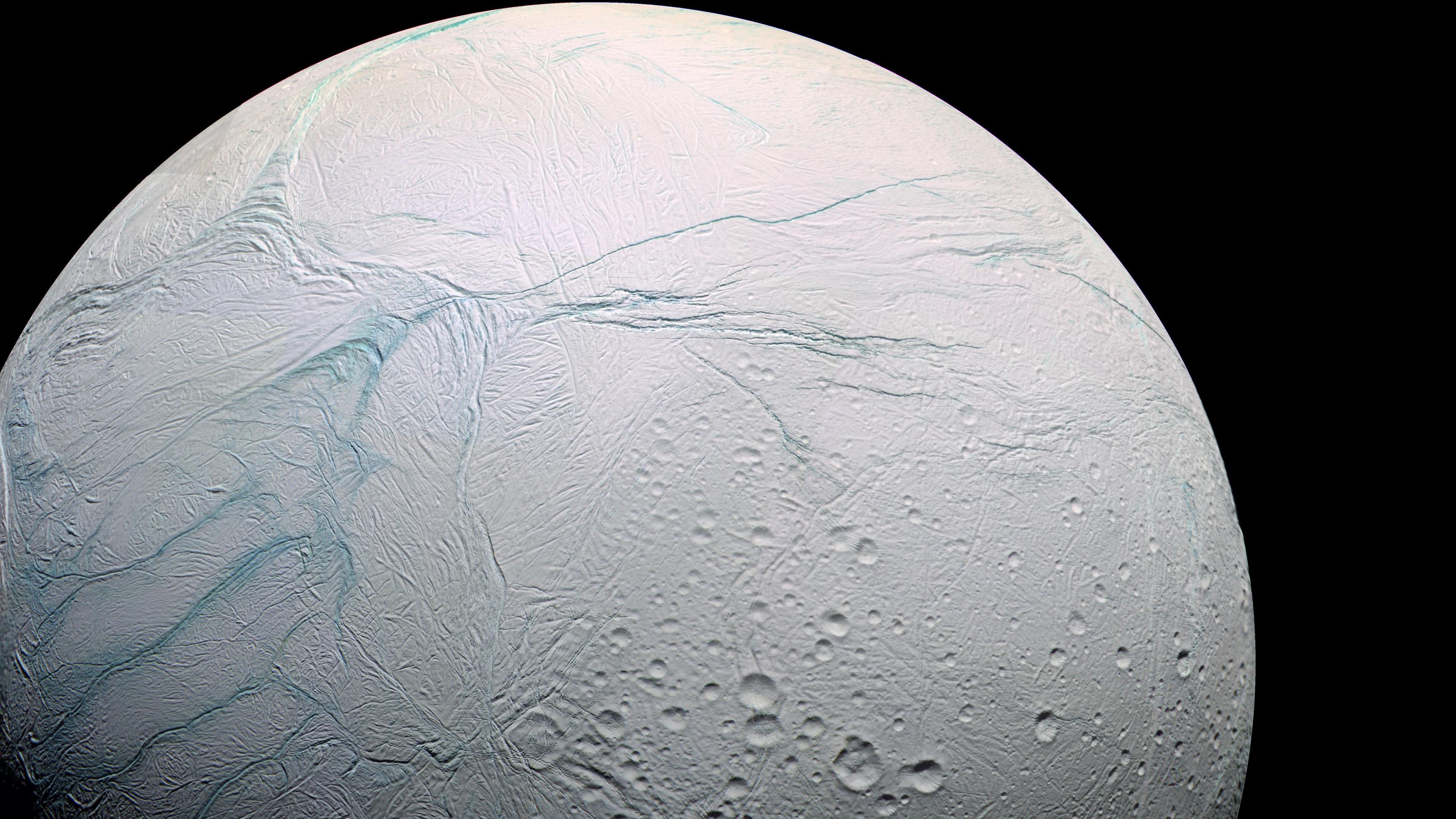 Enceladus, Moon, Saturn, Cryovolcanic 4K Wallpaper Background with a maximum resolution of 3840x2160 px.