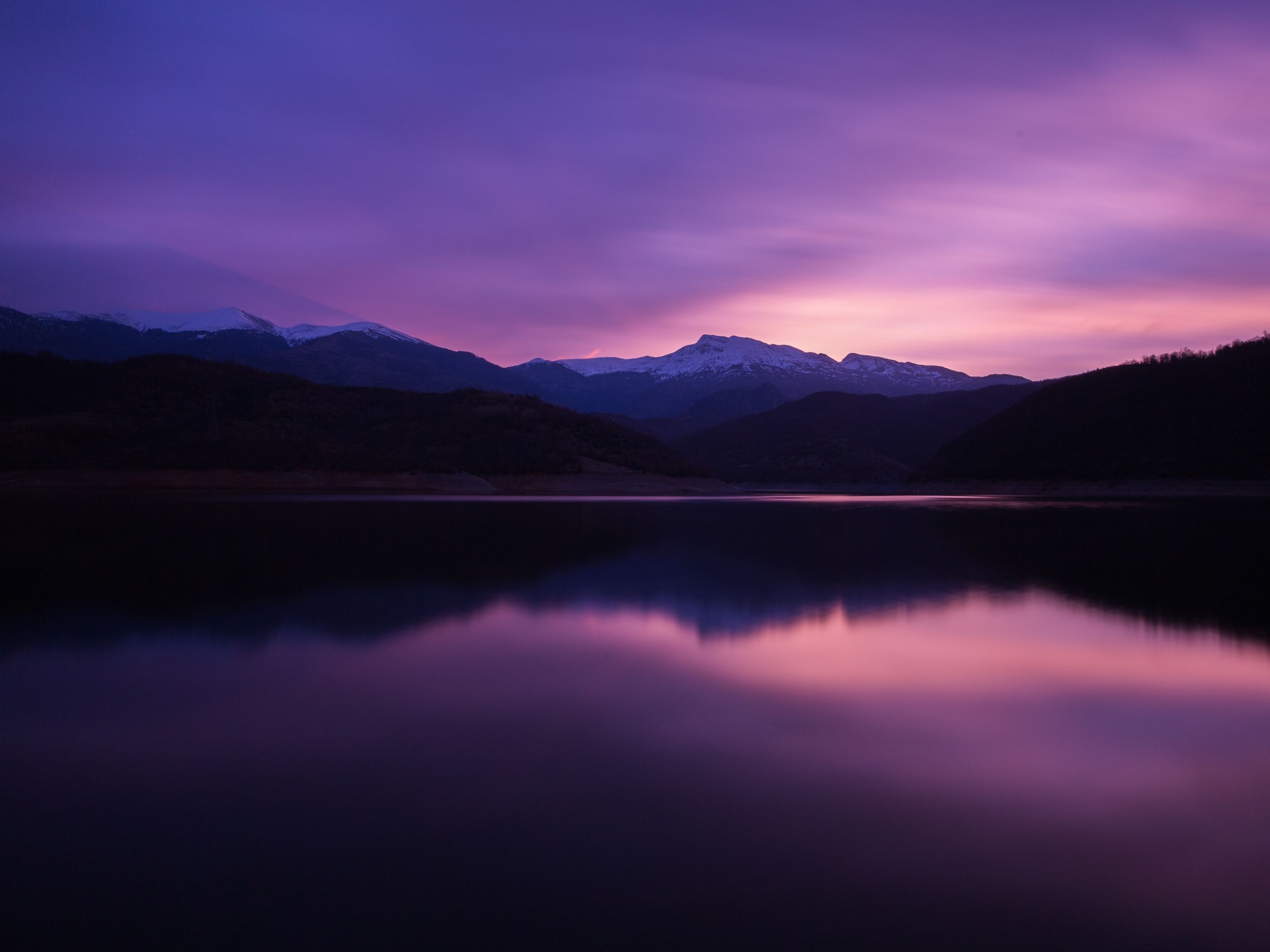 Mountains, Lake, Sunset, Purple 4K Wallpaper Background with a maximum resolution of 3840x2160 px.