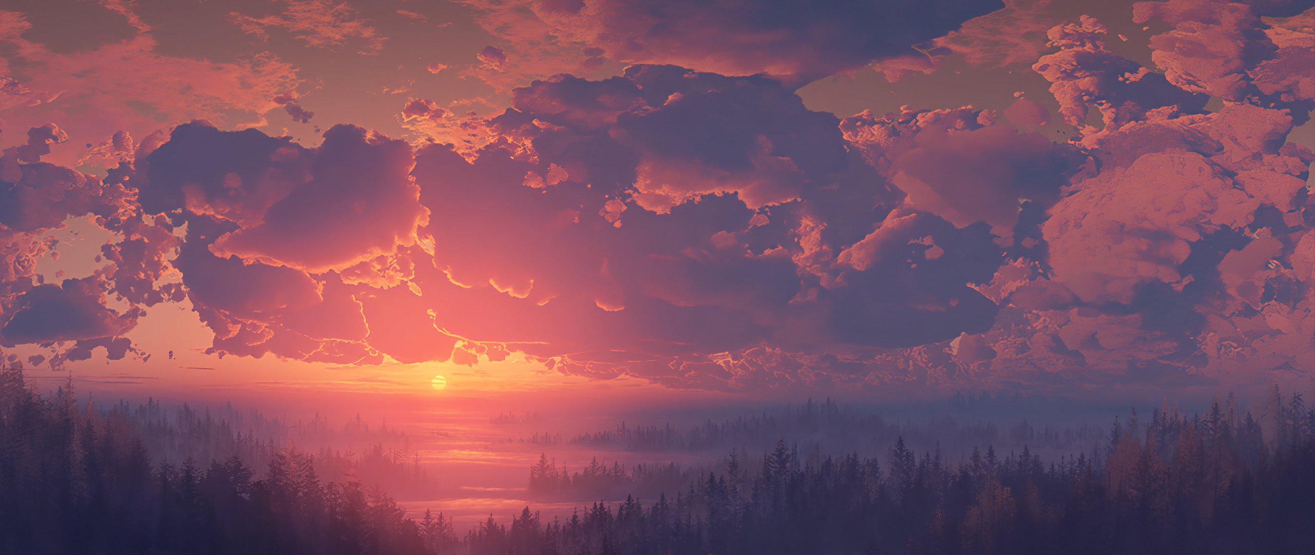 Sunset, Clouds, Forest, Dusk, Landscape 4K Wallpaper Background with a maximum resolution of 3840x2160 px.