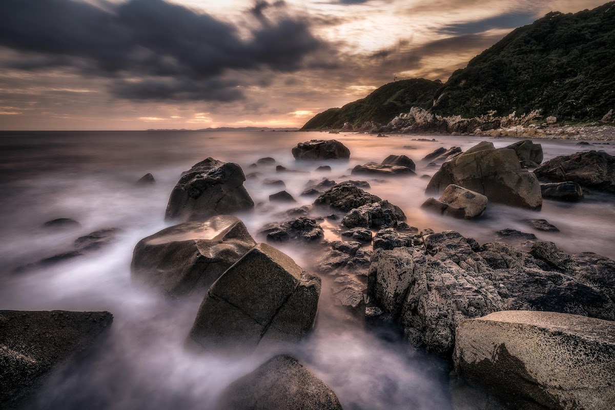 Seascape, Coastline, Rocks, Long Exposure 5K Wallpaper Background with a maximum resolution of 5900x3933 px.