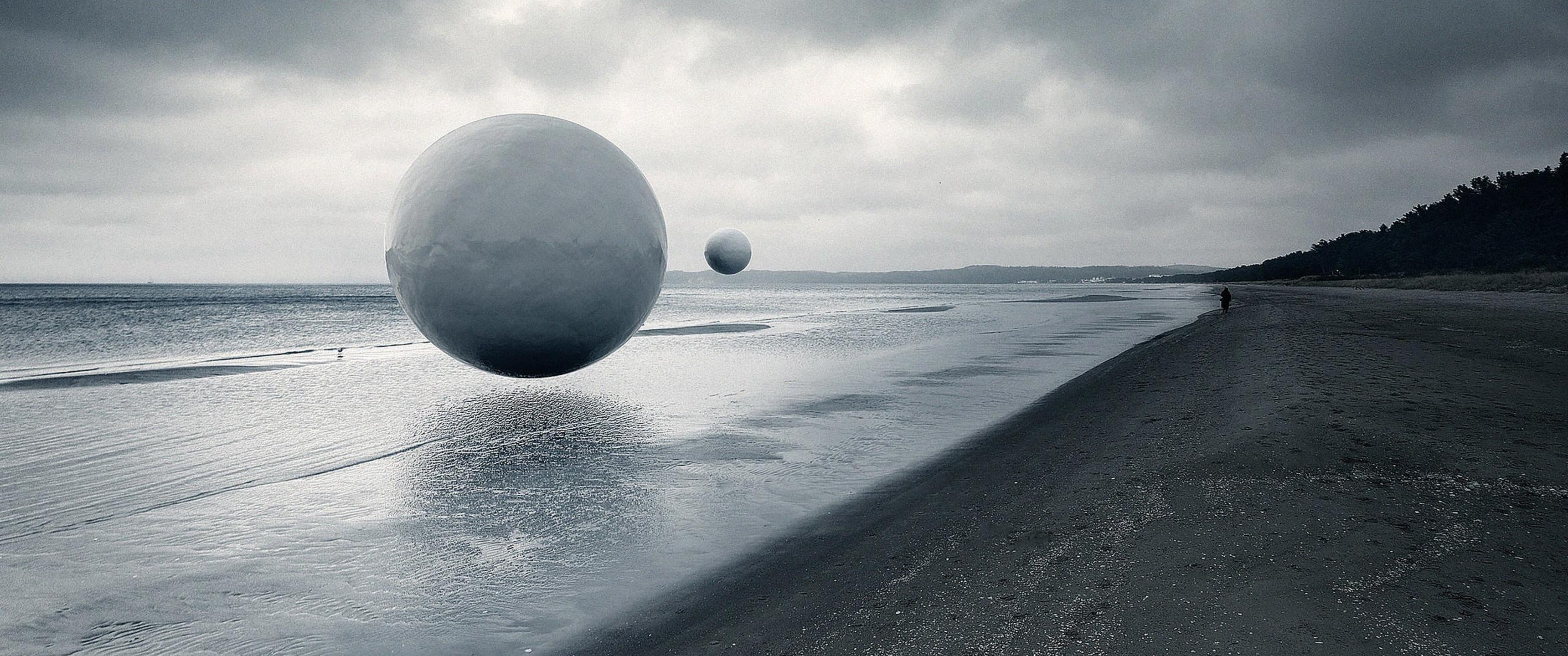 Surreal, Spheres, Beach, Monochrome 2K Wallpaper Background with a maximum resolution of 2560x1440 px.