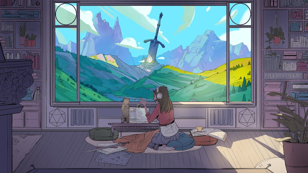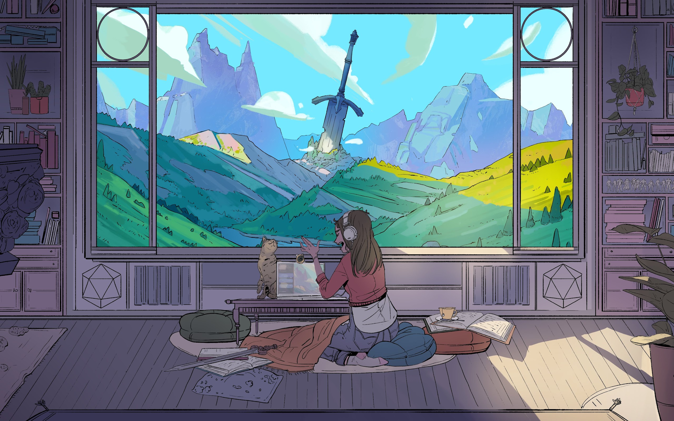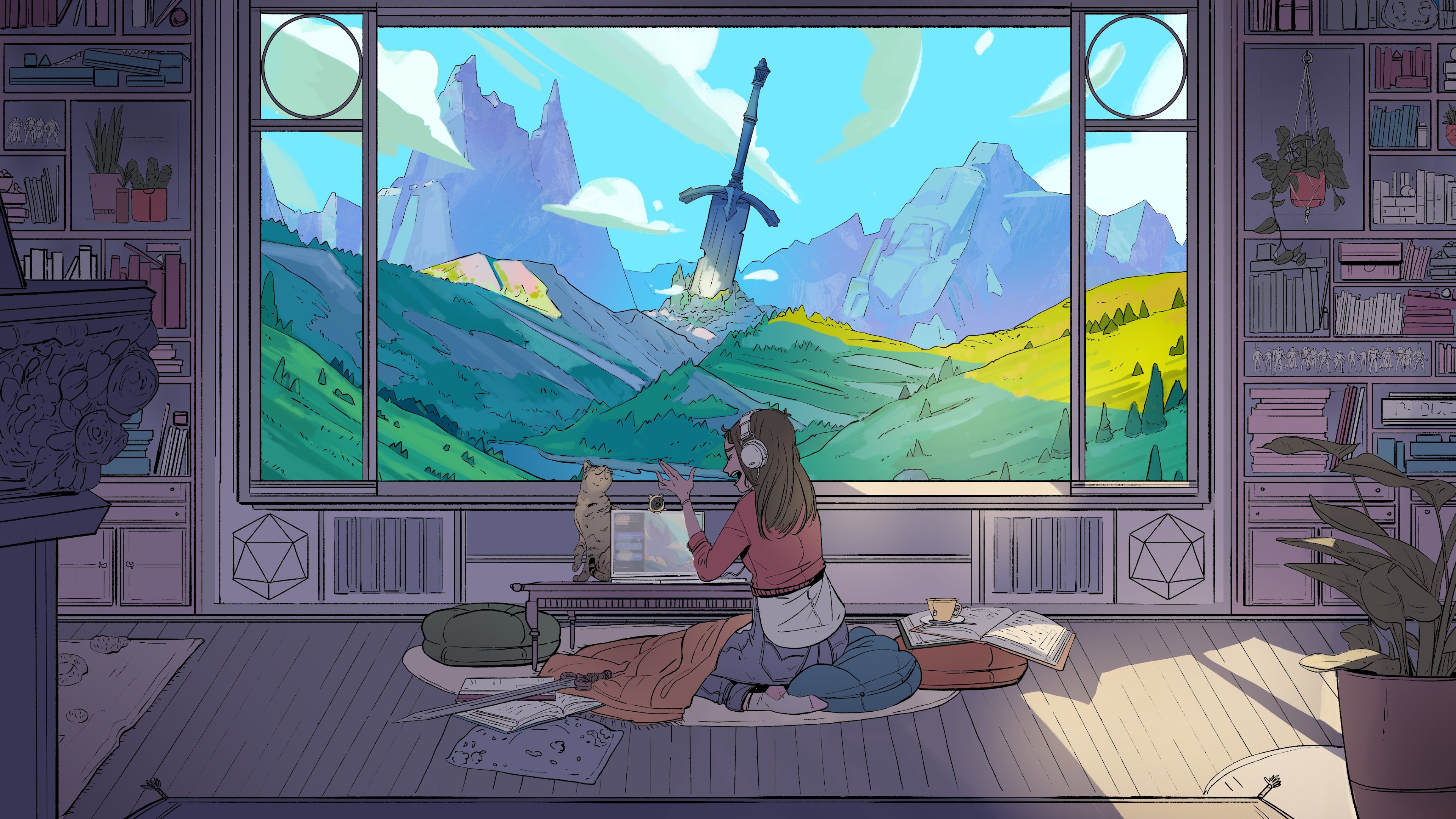 Fantasy, Sword, Mountains, Girl, Cat 4K Wallpaper Background with a maximum resolution of 4096x2305 px.