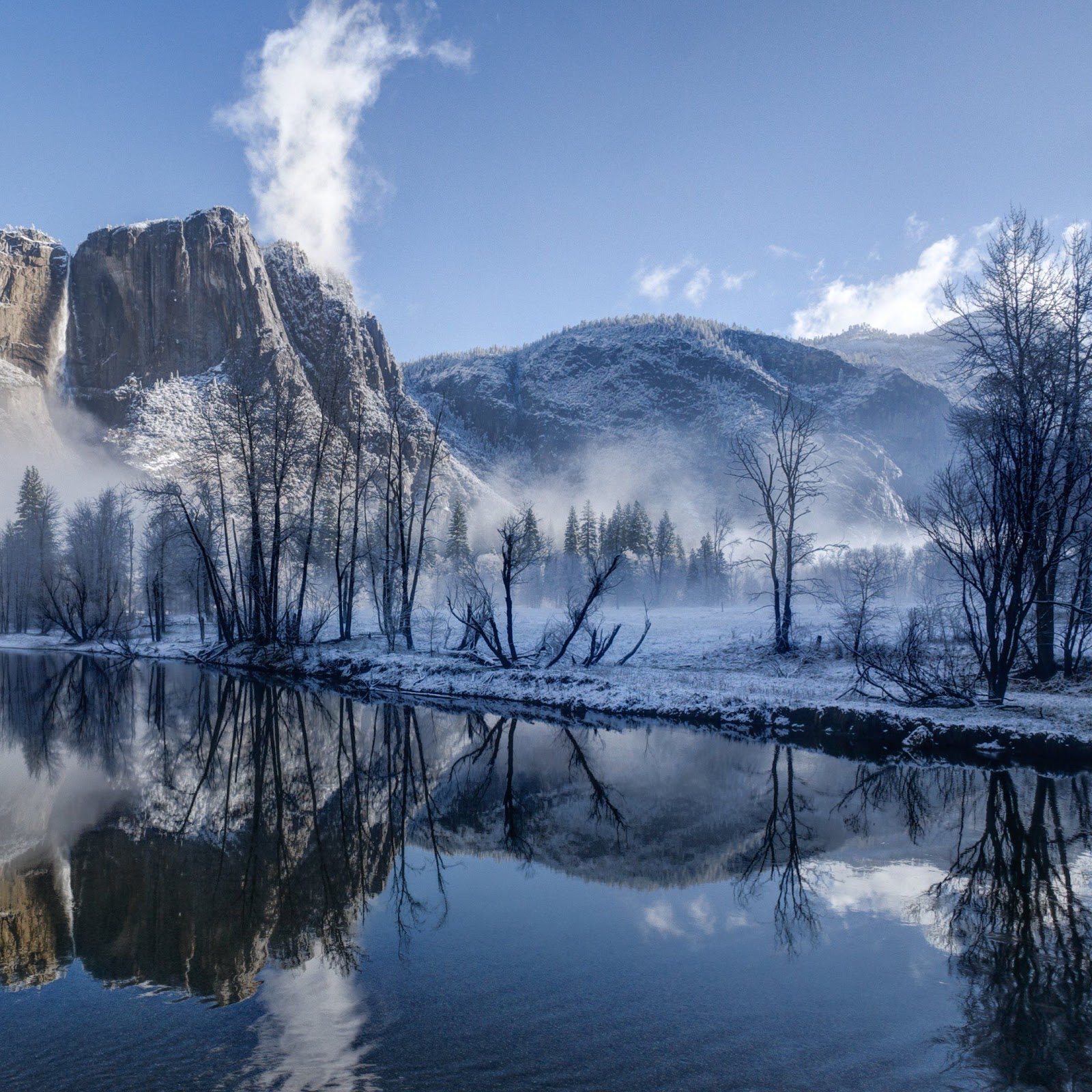 Yosemite, Winter, Reflection, Mountains 4K Wallpaper Background with a maximum resolution of 3840x2160 px.