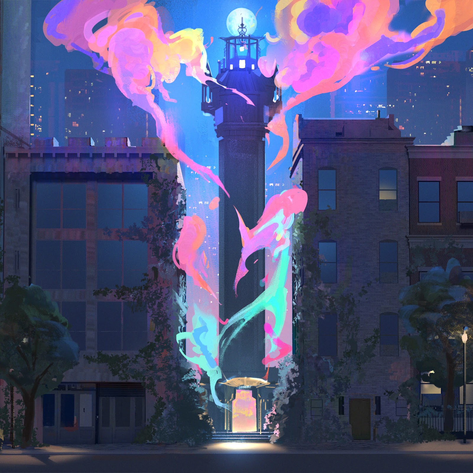 Lighthouse, Smoke, Neon, Cityscape 2K Desktop Wallpaper