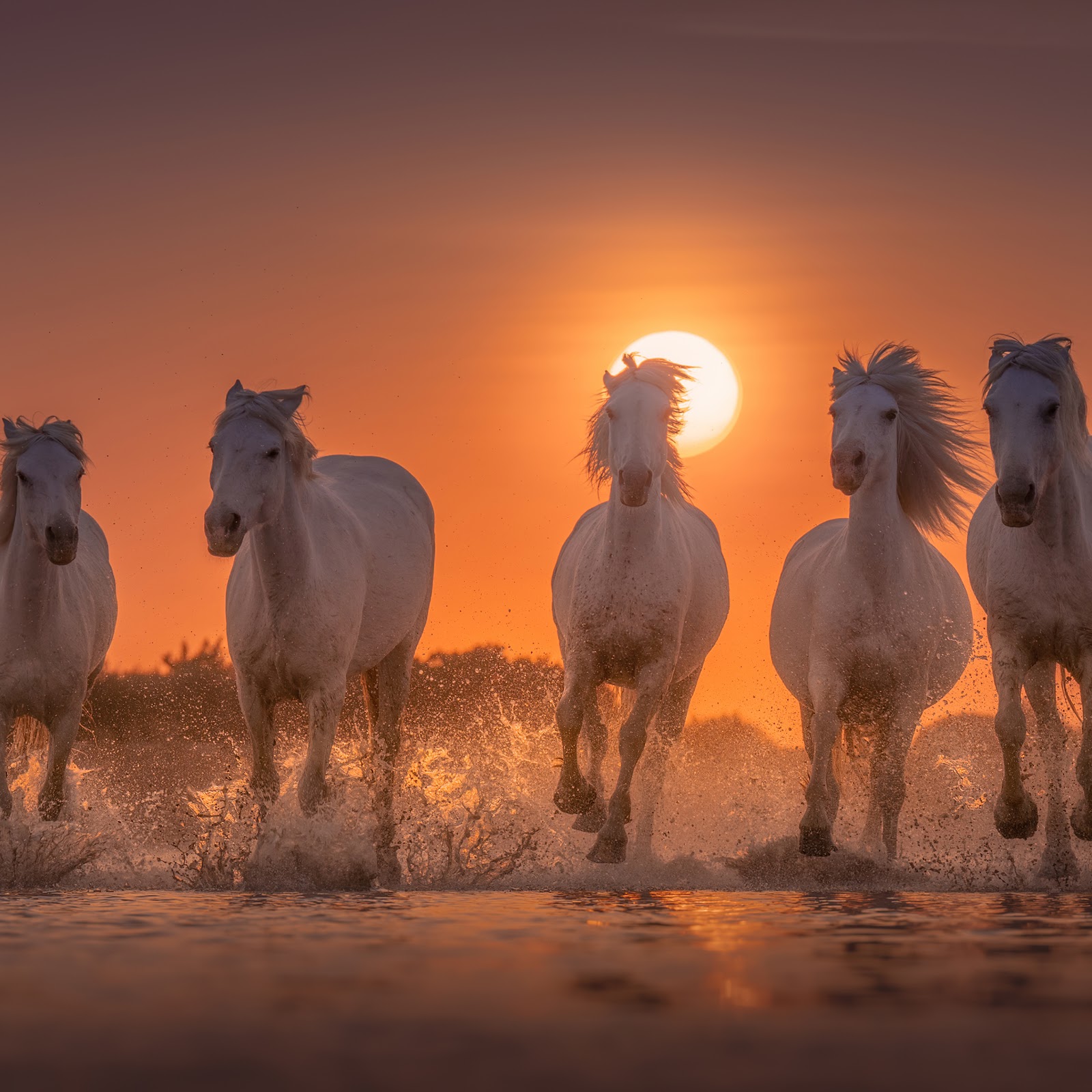 Camargue Horses, Sunset, Running, Water 4K Wallpaper Background with a maximum resolution of 3840x2559 px.