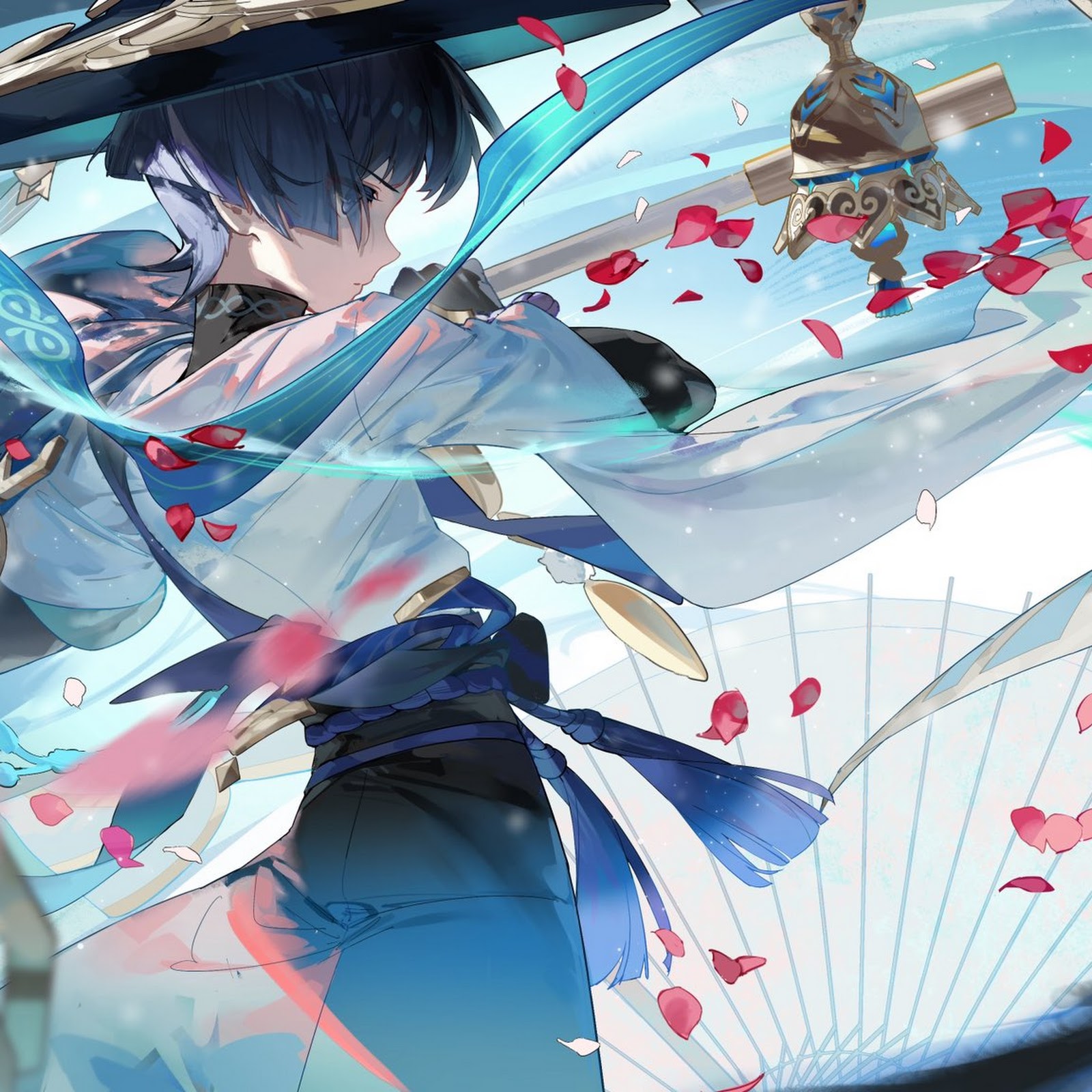 Anime, Anime Boys, Genshin Impact, Petals, Standing Full HD Wallpaper Background with a maximum resolution of 2048x1152 px.