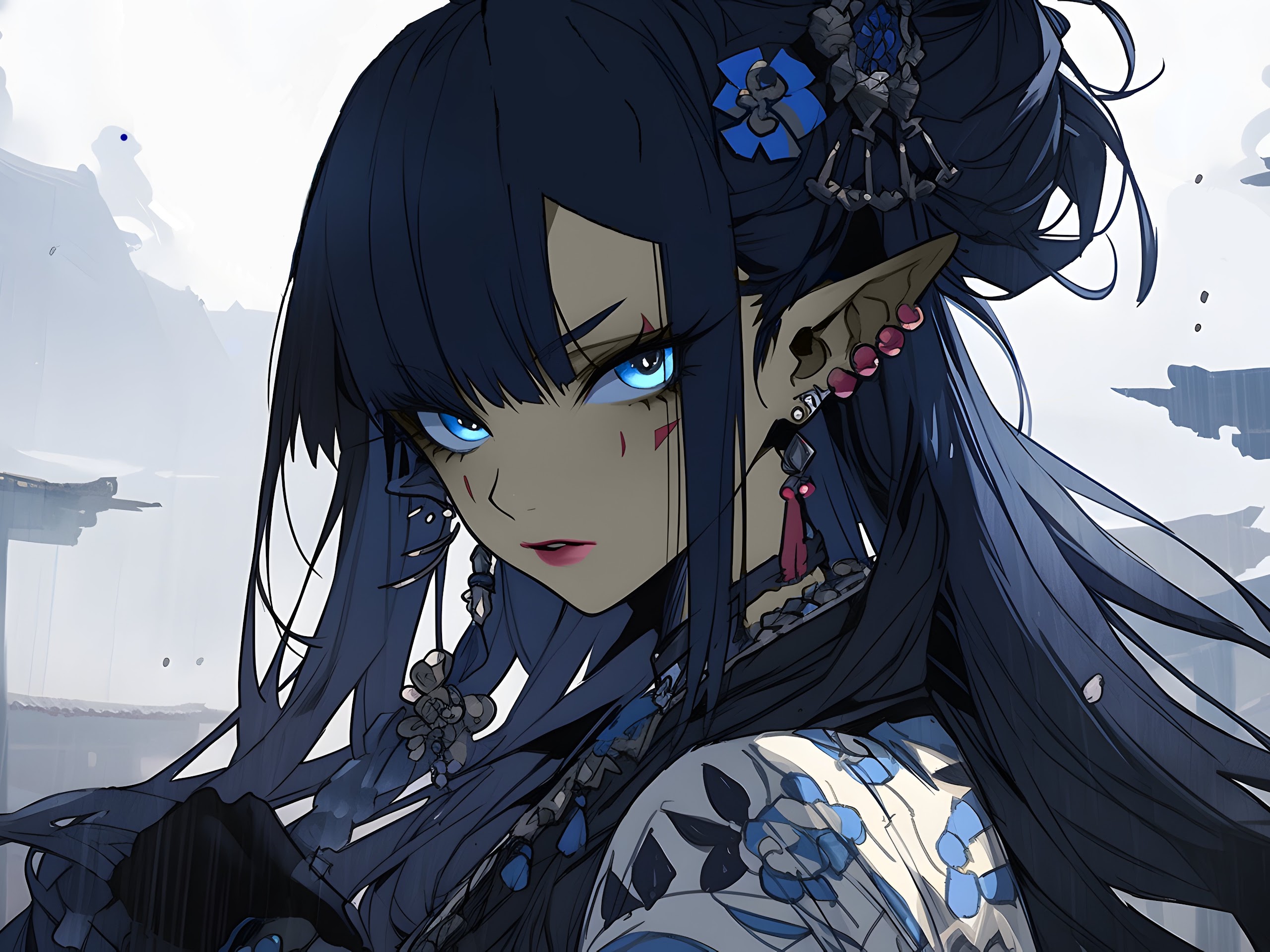 Anime Girls, Blue Hair, Blue Hairpin, Blue Eyes, Pointy Ears 5K Desktop Wallpaper