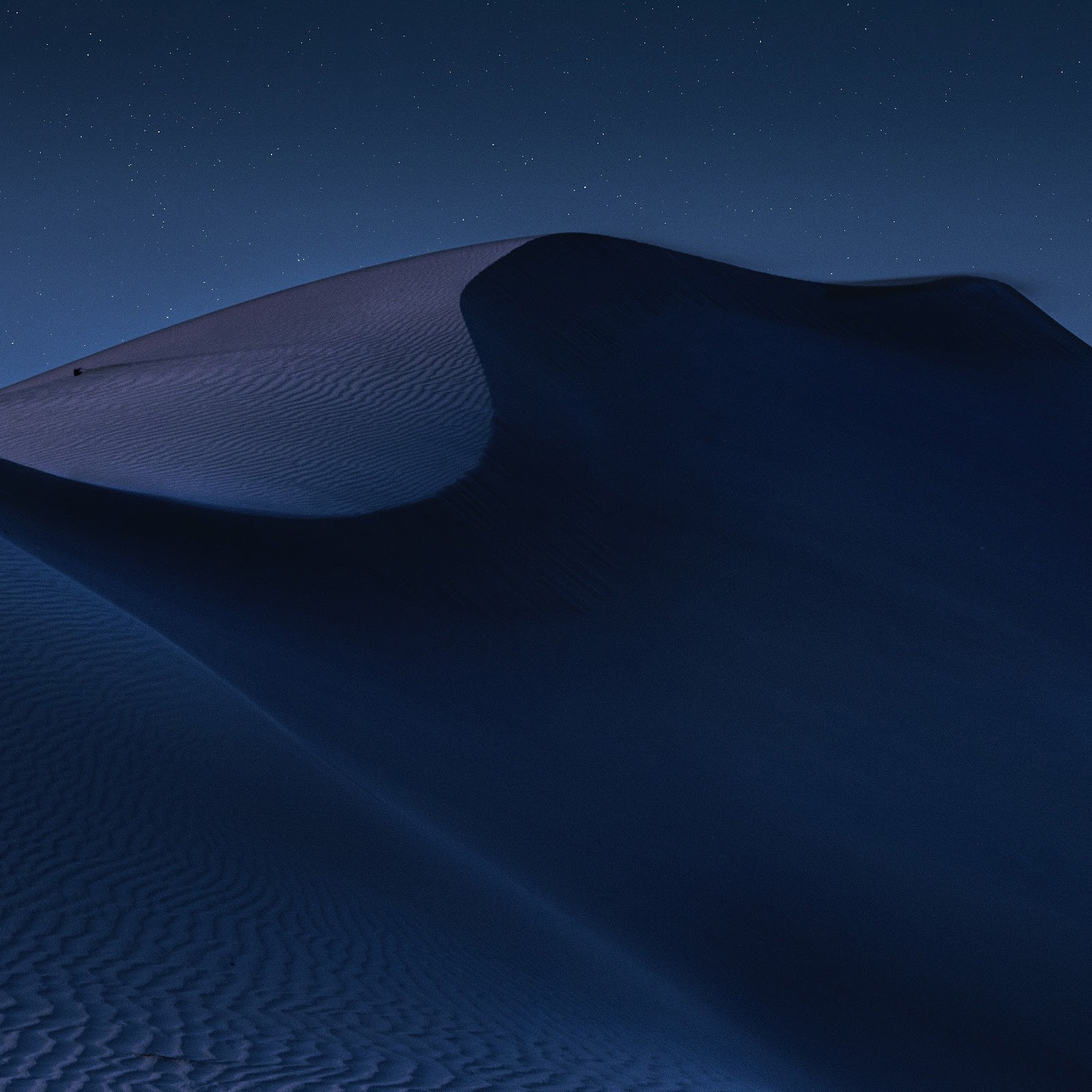 Desert, Night, Landscape, Sky Blue, Minimalism 5K Wallpaper Background with a maximum resolution of 5397x3602 px.