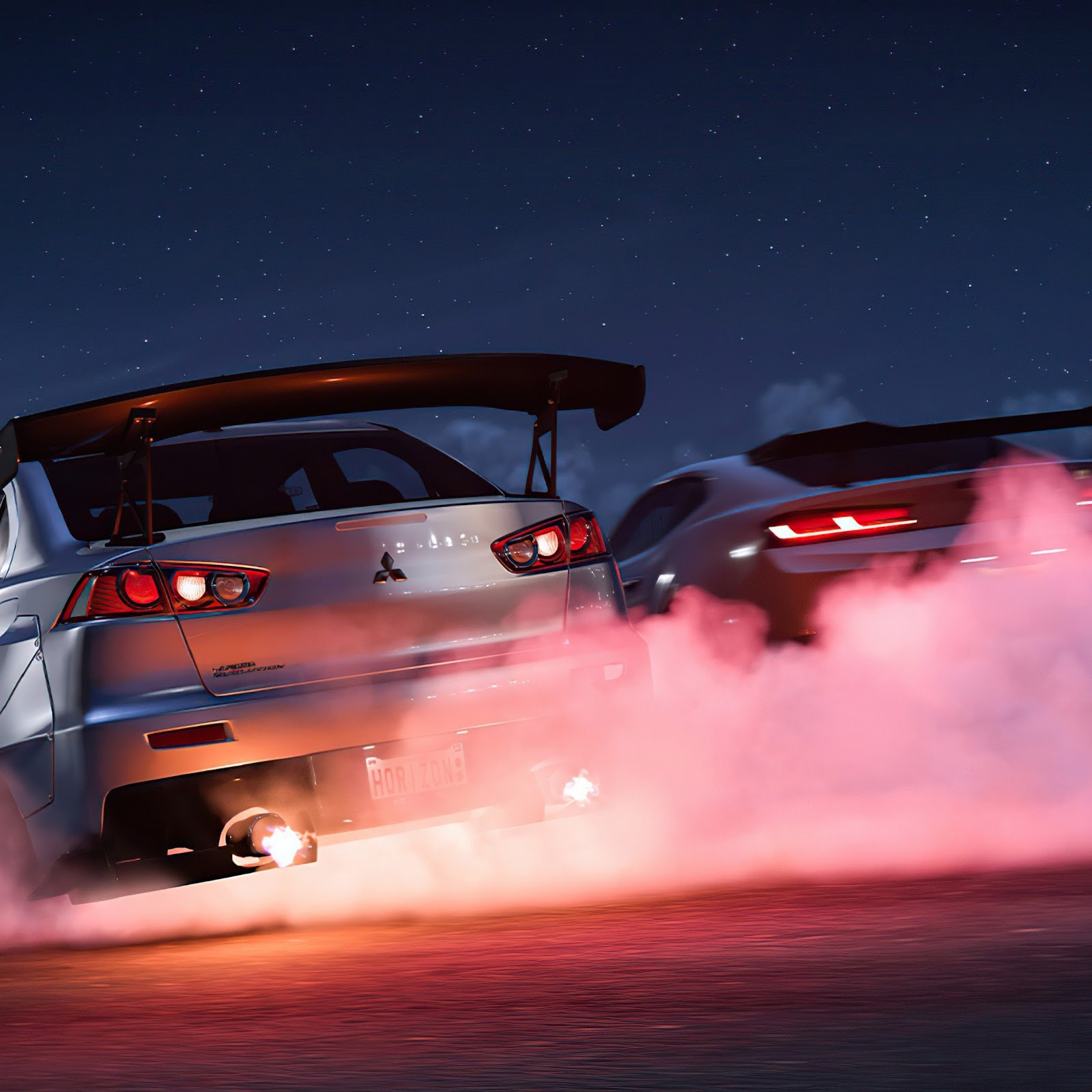 Forza Horizon 5, Screen Shot, Mitsubishi Lancer EVO, Chevrolet Corvette C8, Burnout, Racing Wallpaper Background with a maximum resolution of 3840x2160 px.