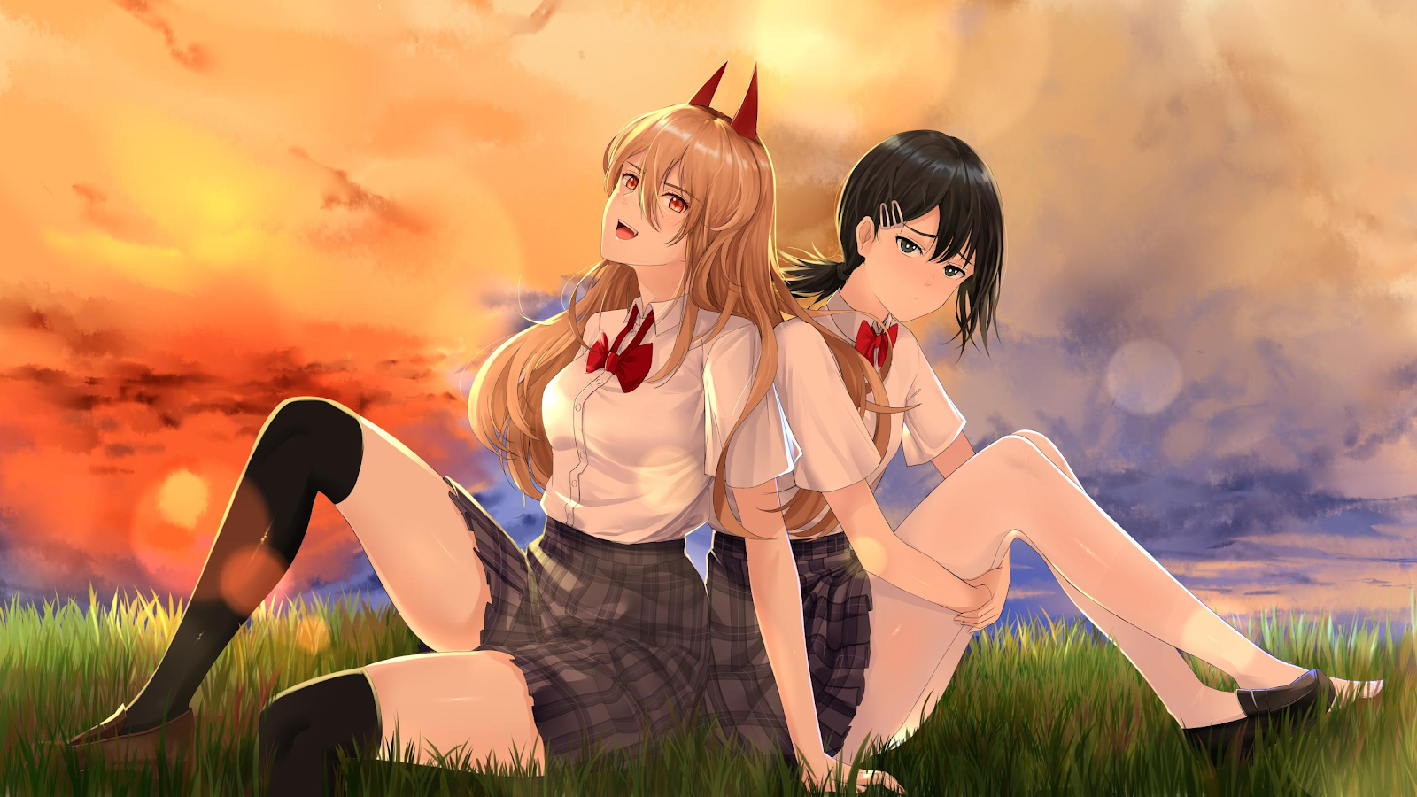 Power (Chainsaw Man), Kobeni (Chainsaw Man), Schoolgirl, Sunlight, Anime Girls 2K Desktop Wallpaper