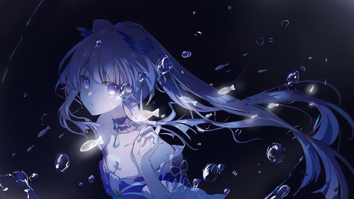 Sangonomiya Kokomi (Genshin Impact), Water Drops, Fish, Pink Hair, Purple Eyes 4K Desktop Wallpaper