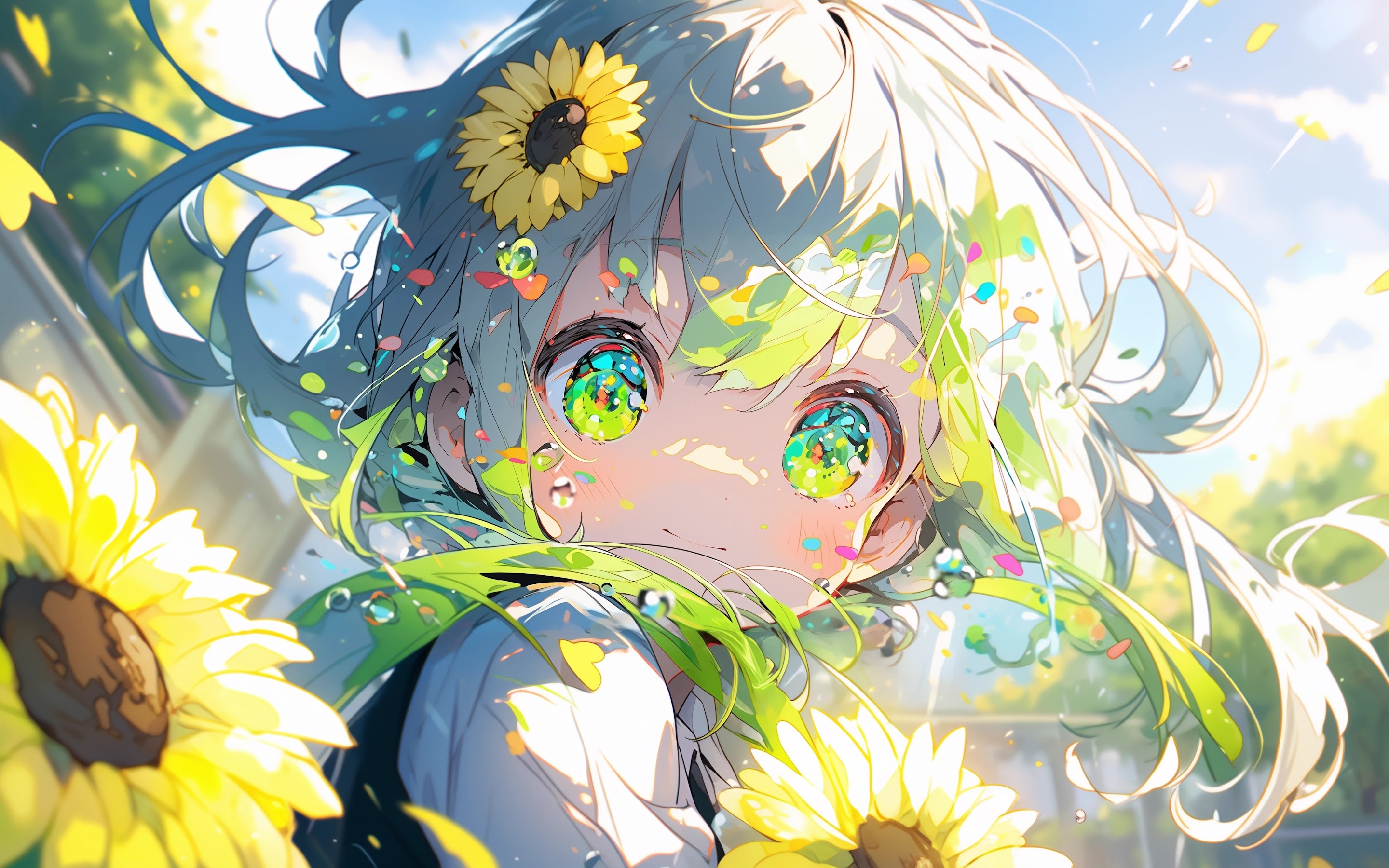 Sunflowers, Flower In Hair, Petals, Sky, Smiling 5K Wallpaper Background with a maximum resolution of 5824x3264 px.