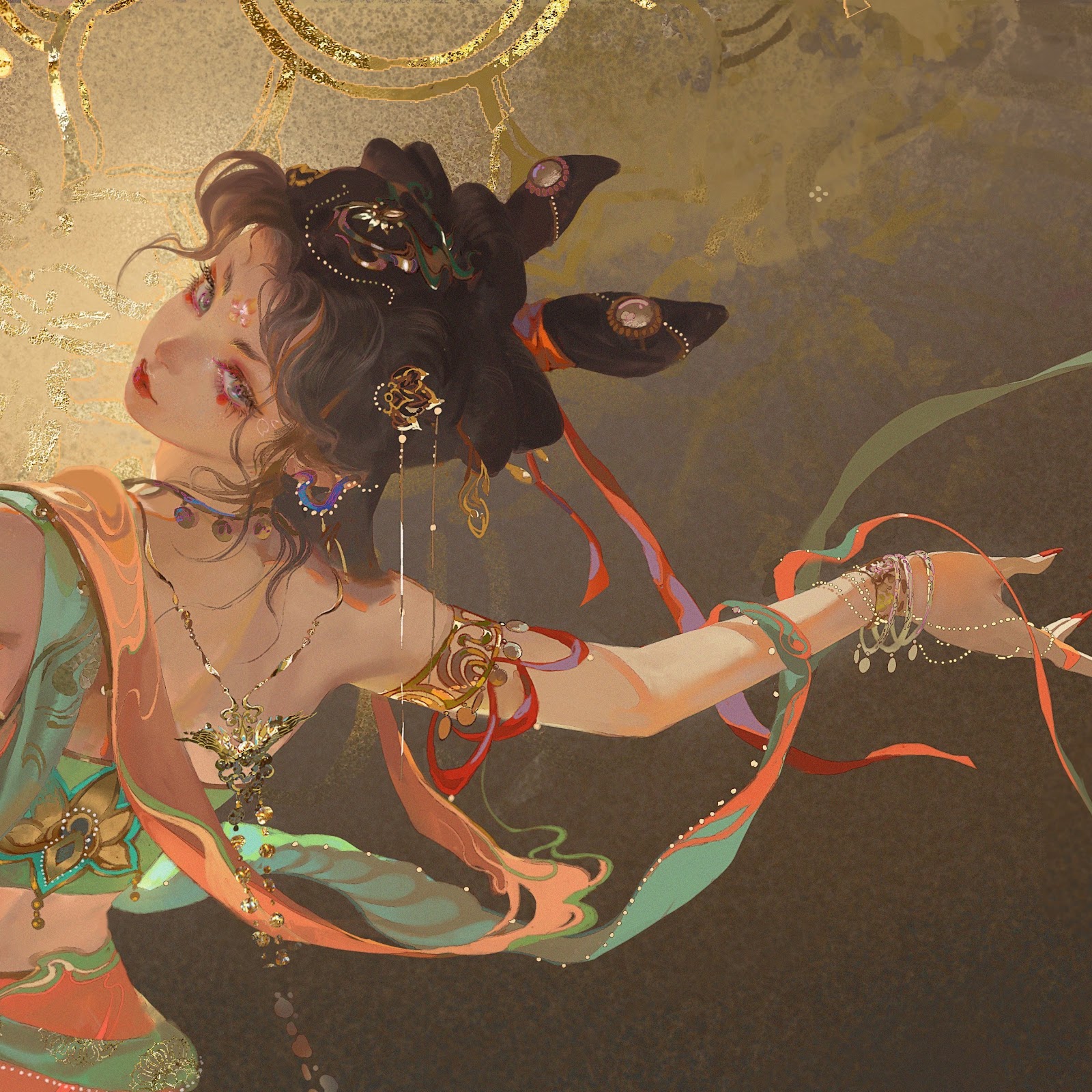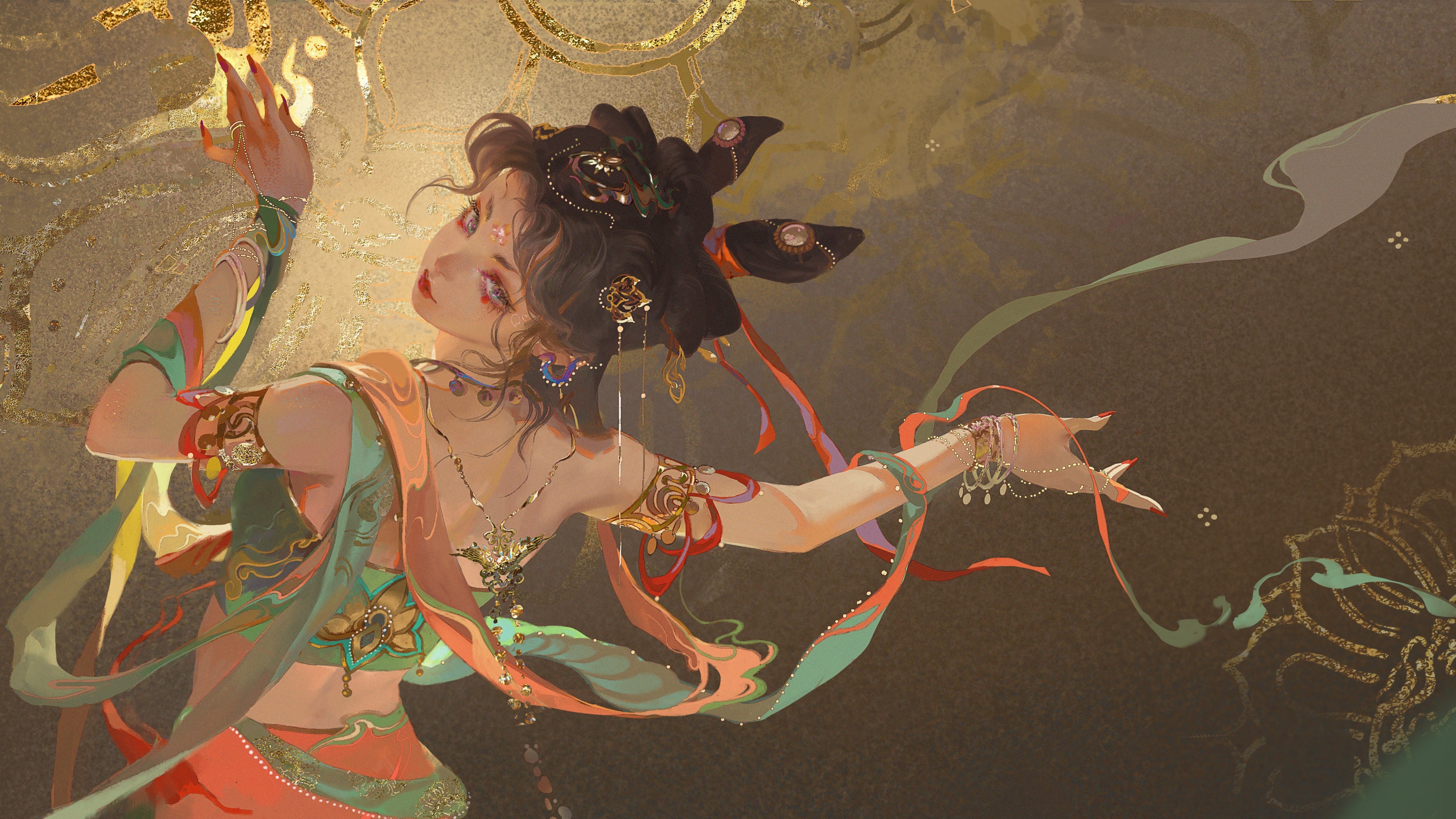 Tea Me, Gold, Dancing, Women, Minimalism 5K Wallpaper Background with a maximum resolution of 6530x2959 px.
