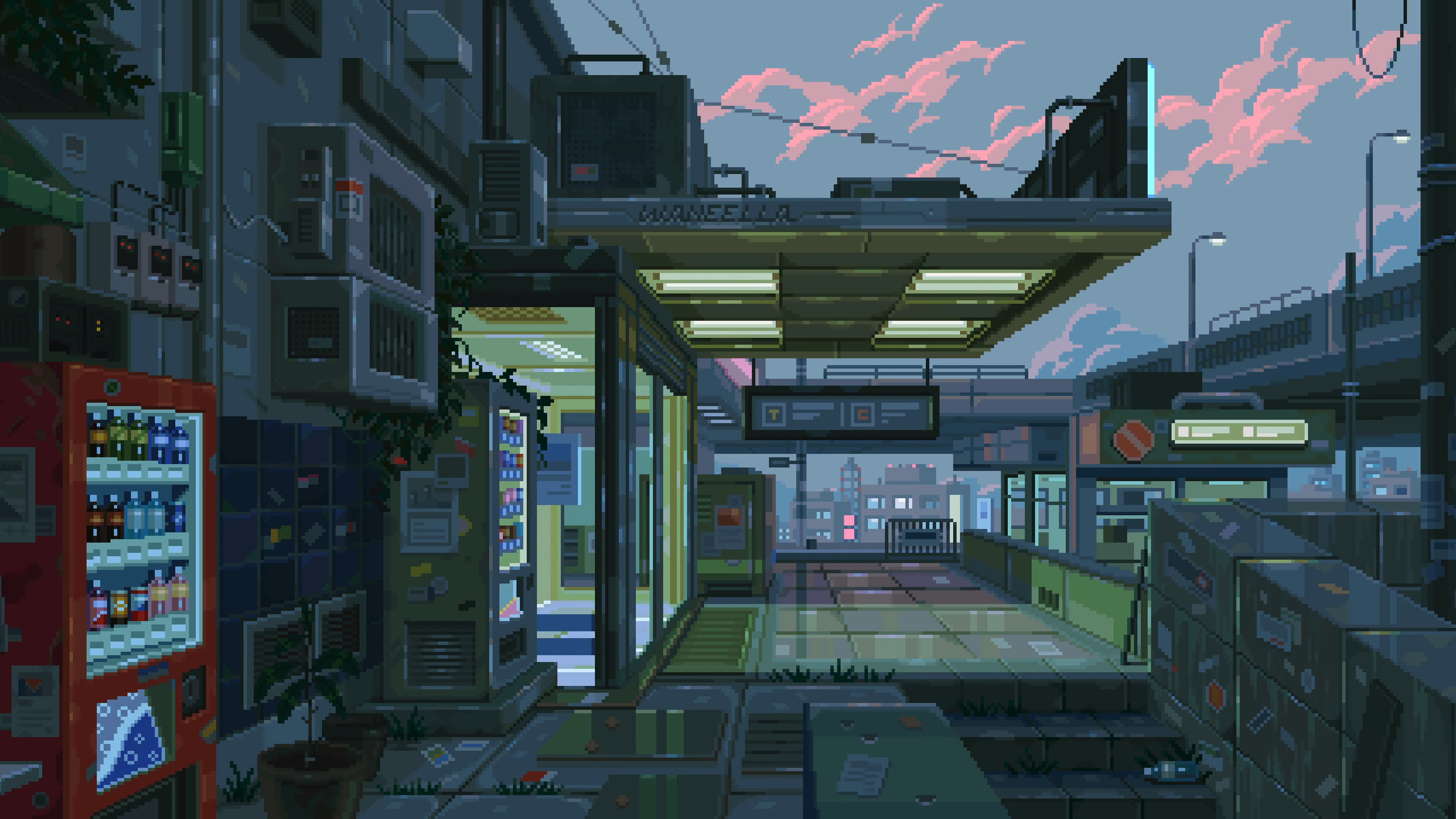 Waneella, City, Pixel Art, Lights, Cyberpunk 2K Wallpaper Background with a maximum resolution of 3840x1920 px.