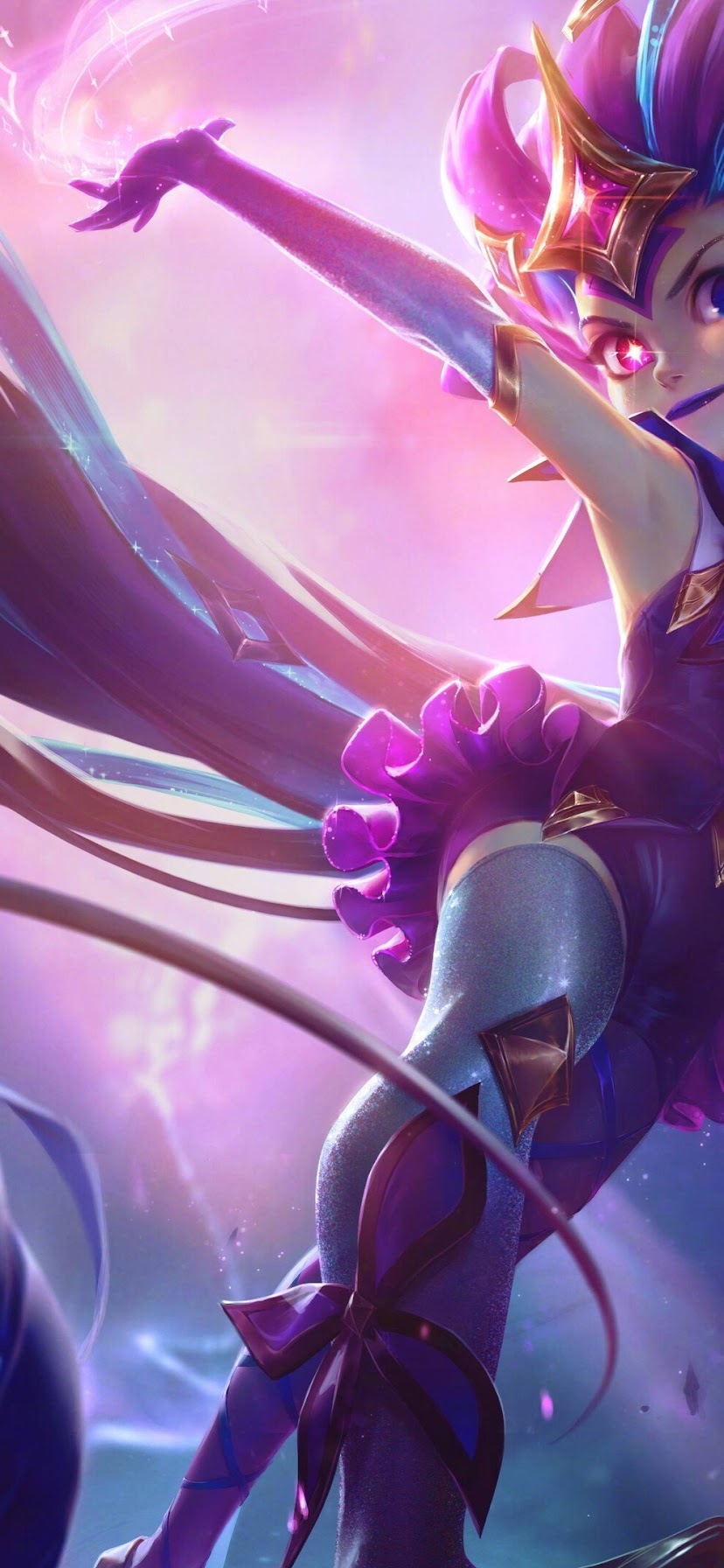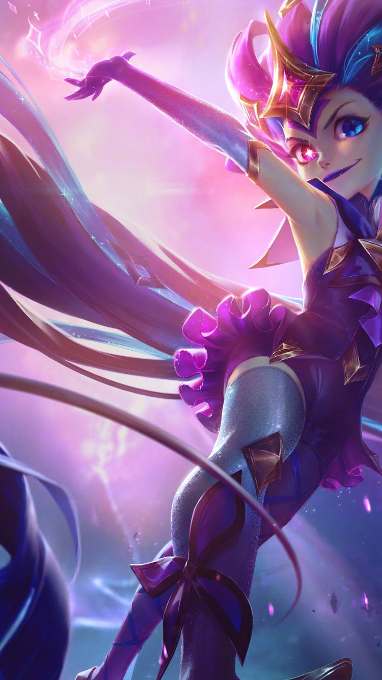 Zoe (League of Legends), Star Guardian, Women, Pink Hair, Blue Hair, Pink Dress 4K Wallpaper Background with a maximum resolution of 3840x2160 px.