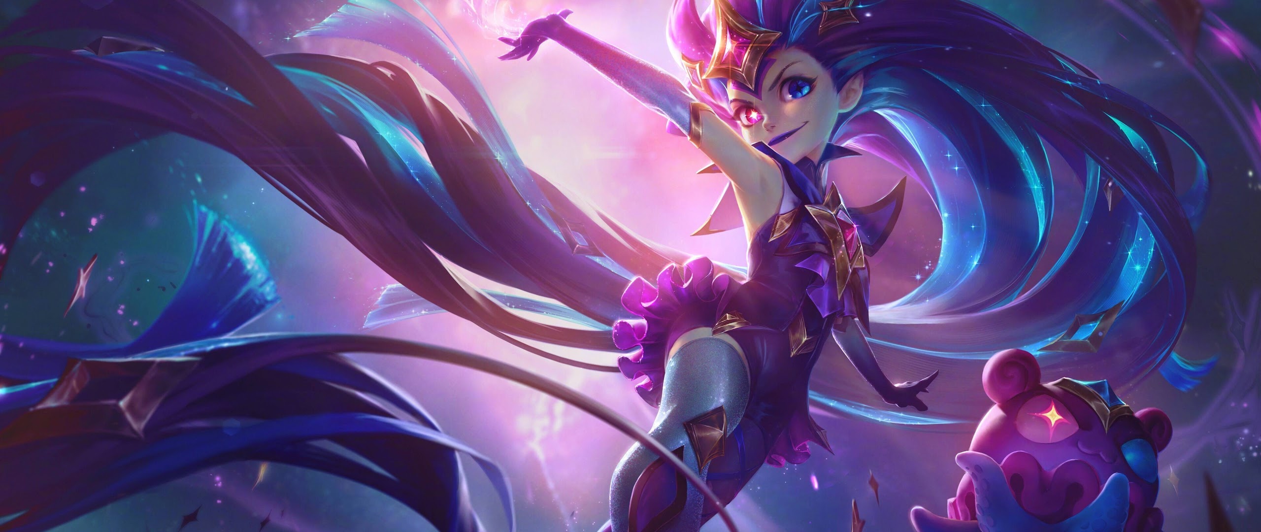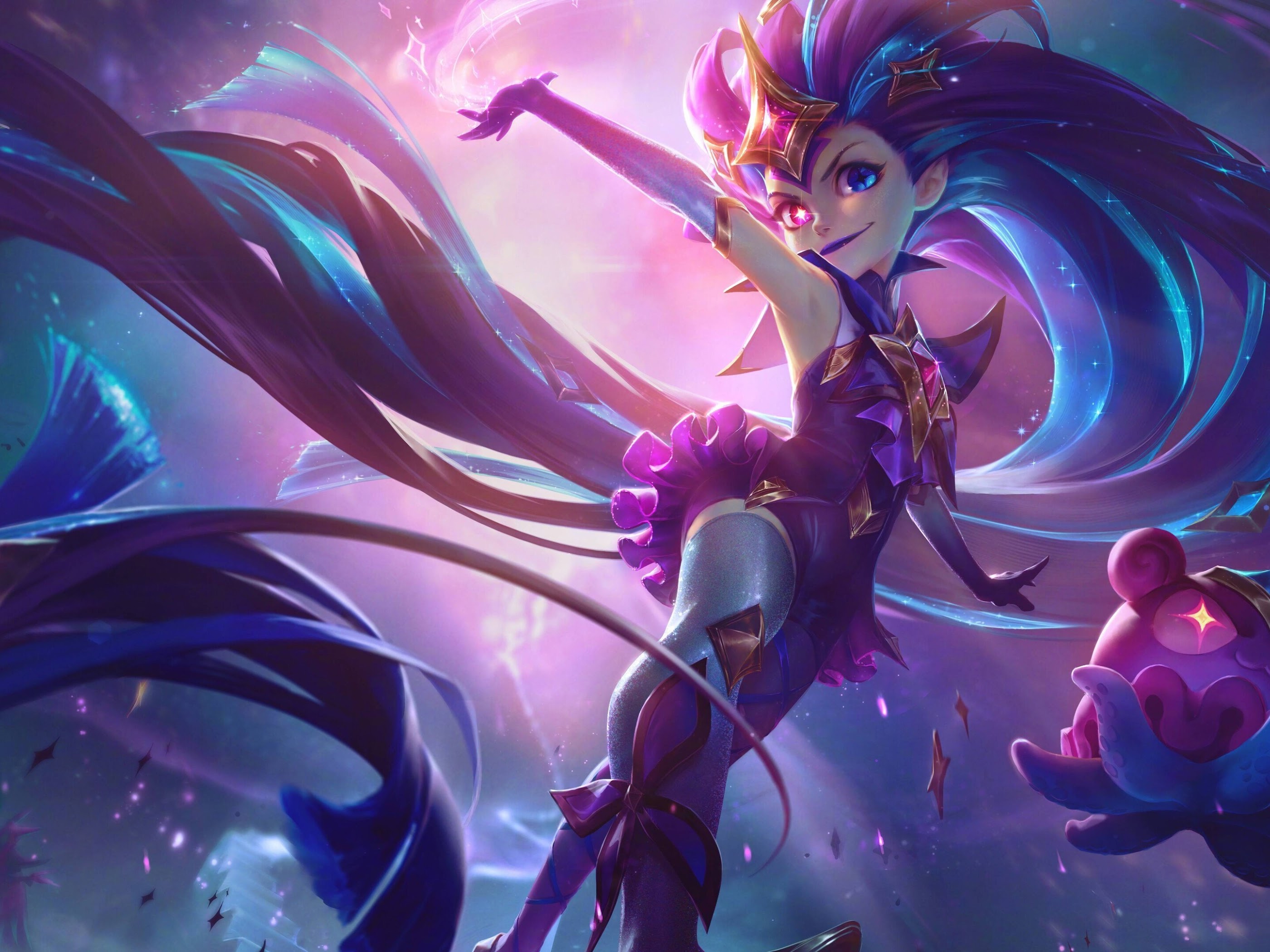 Zoe (League of Legends), Star Guardian, Women, Pink Hair, Blue Hair, Pink Dress 4K Wallpaper Background with a maximum resolution of 3840x2160 px.