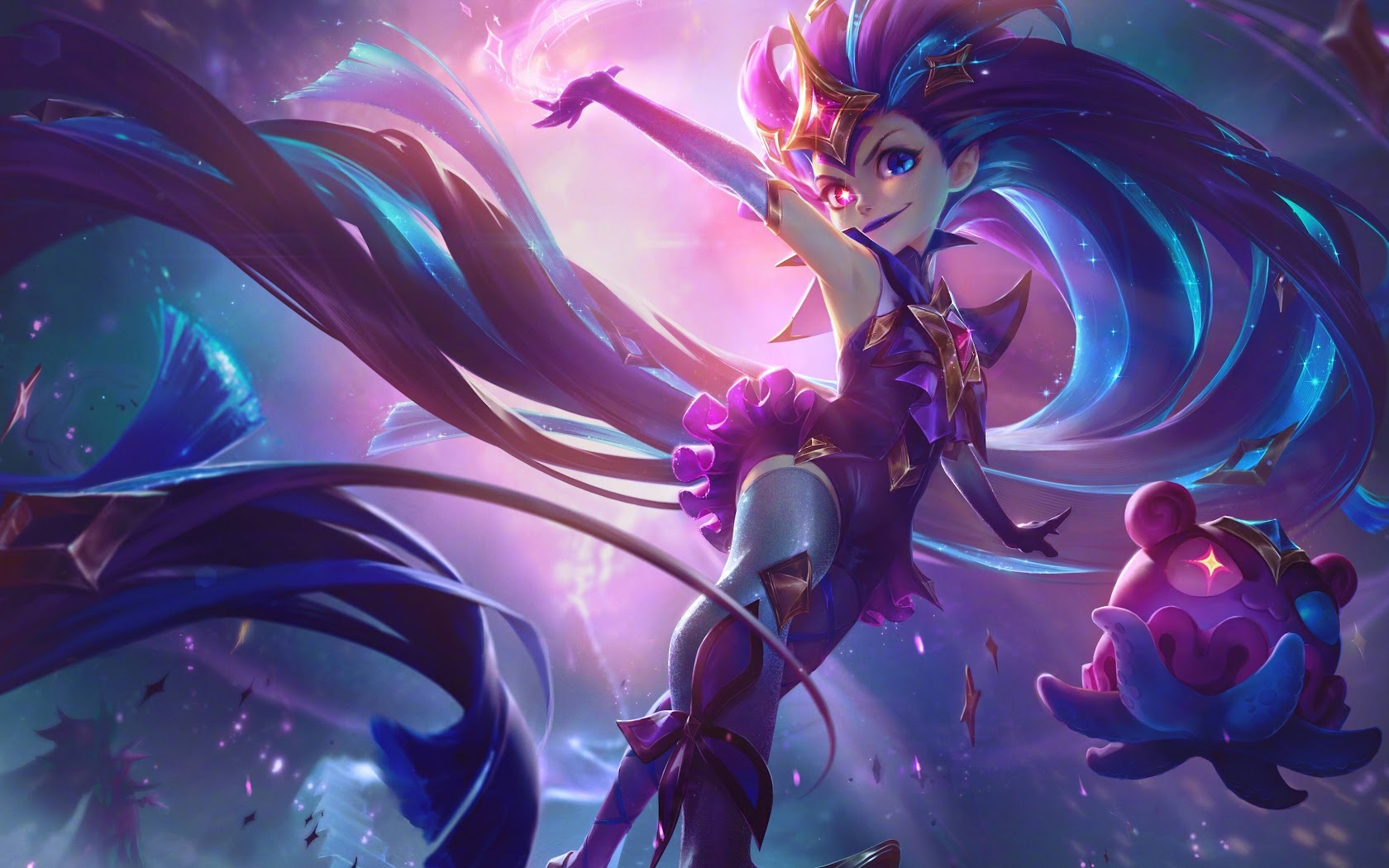 Zoe (League of Legends), Star Guardian, Women, Pink Hair, Blue Hair, Pink Dress 4K Wallpaper Background with a maximum resolution of 3840x2160 px.