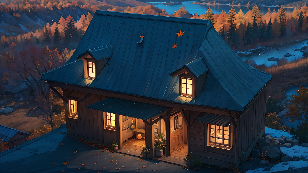 Ai Art, Maple Leaves, House, Night, Leaves 4K Wallpaper Background with a maximum resolution of 3840x2160 px.