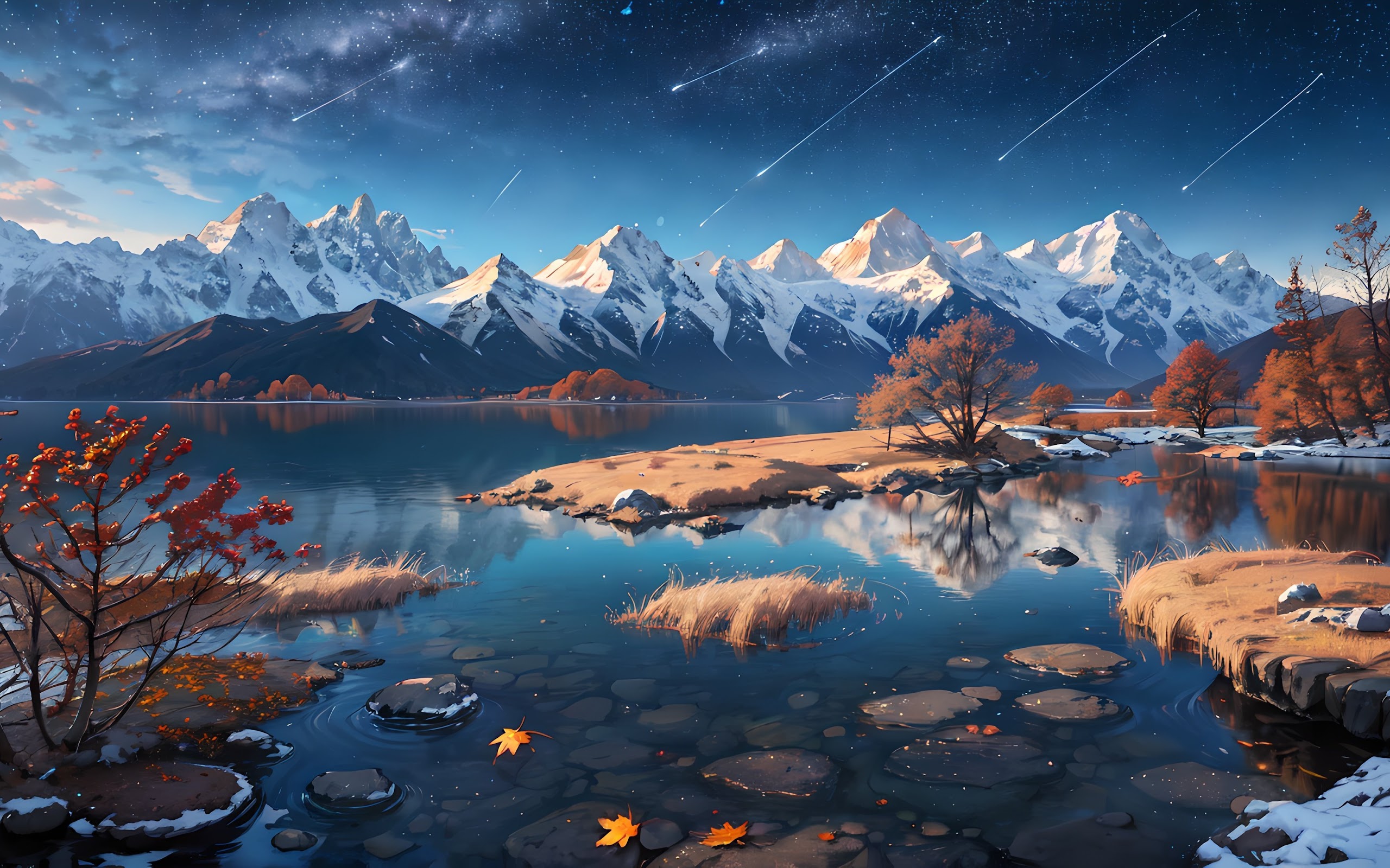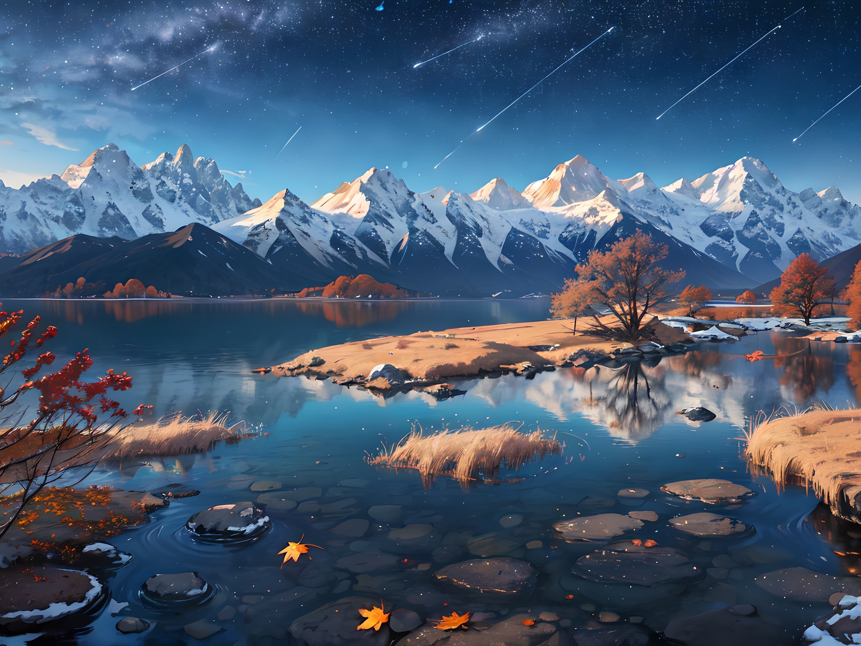 Ai Art, Snowy Peak, Water, Snow Covered, Mountains 4K Wallpaper Background with a maximum resolution of 3840x2160 px.