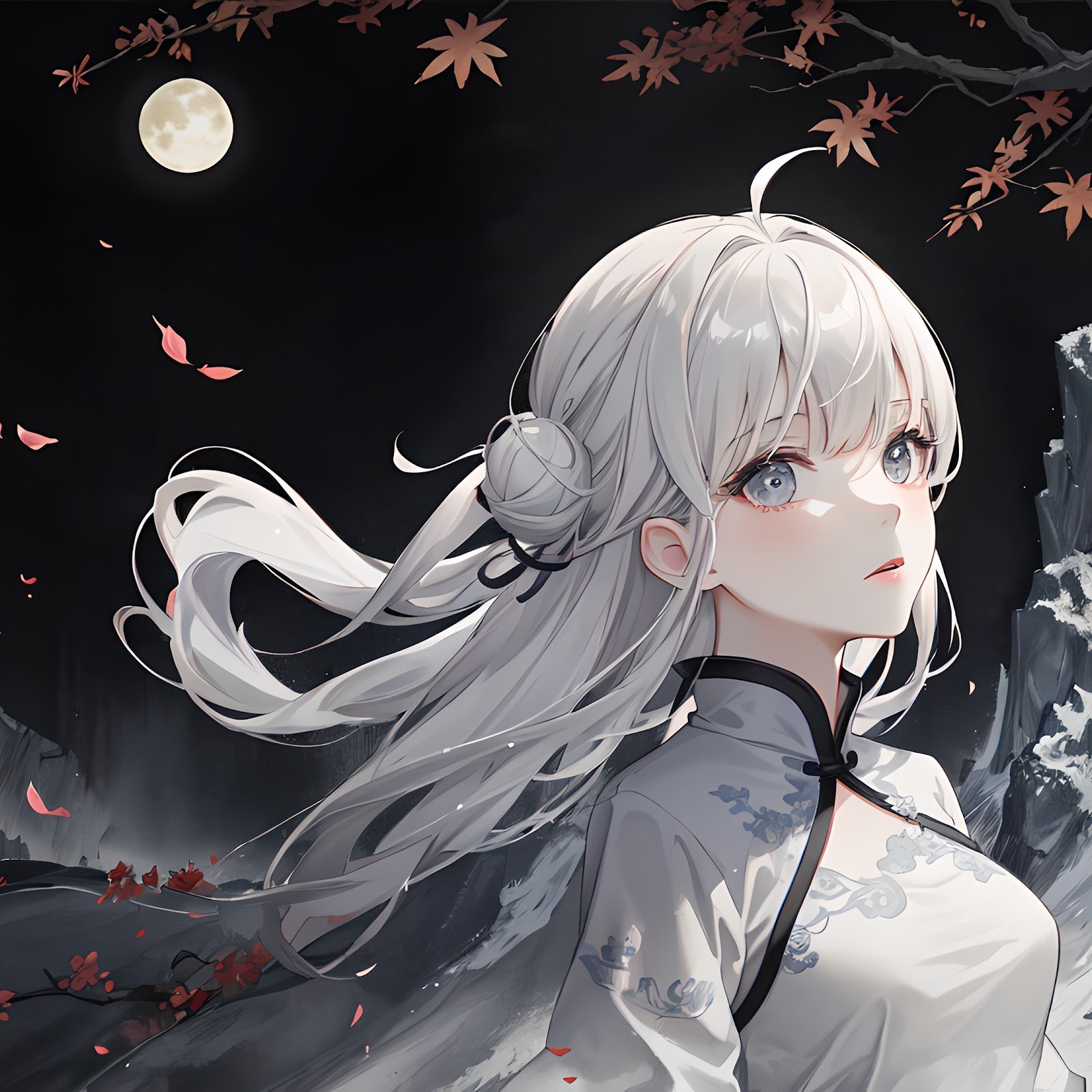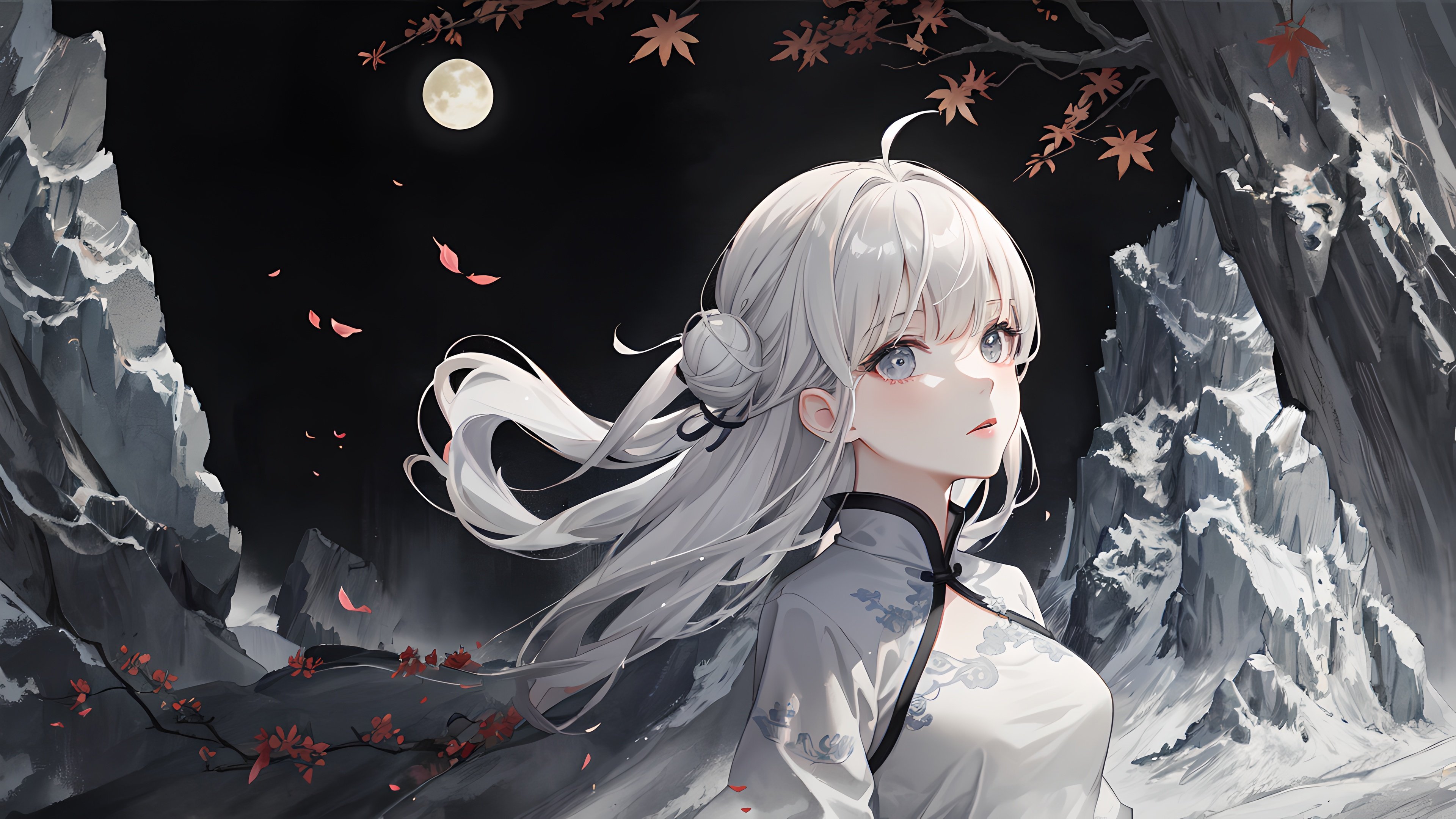 Ai Art, White Hair, White Clothing, Night, Maple Leaves 4K Wallpaper Background with a maximum resolution of 3840x2160 px.