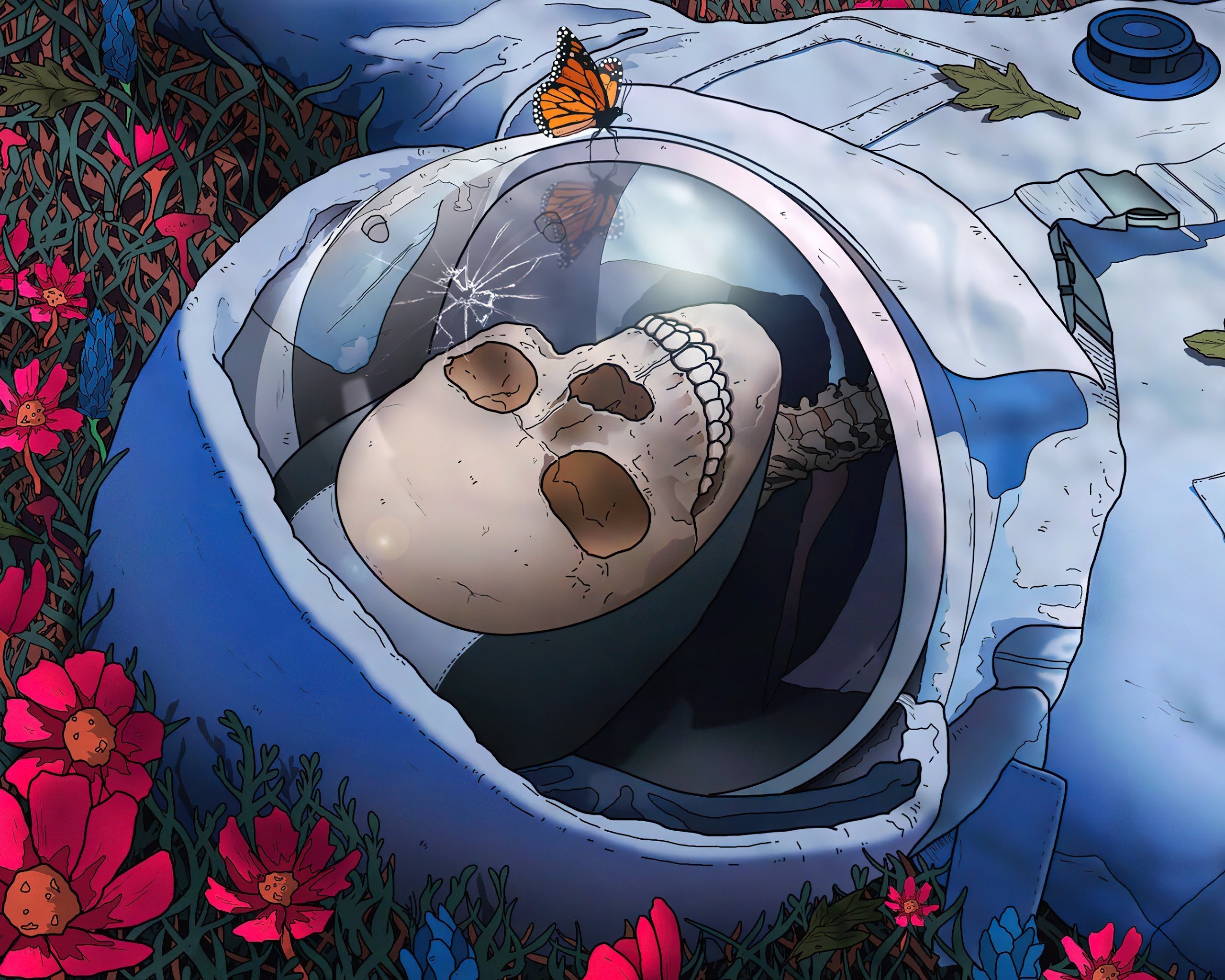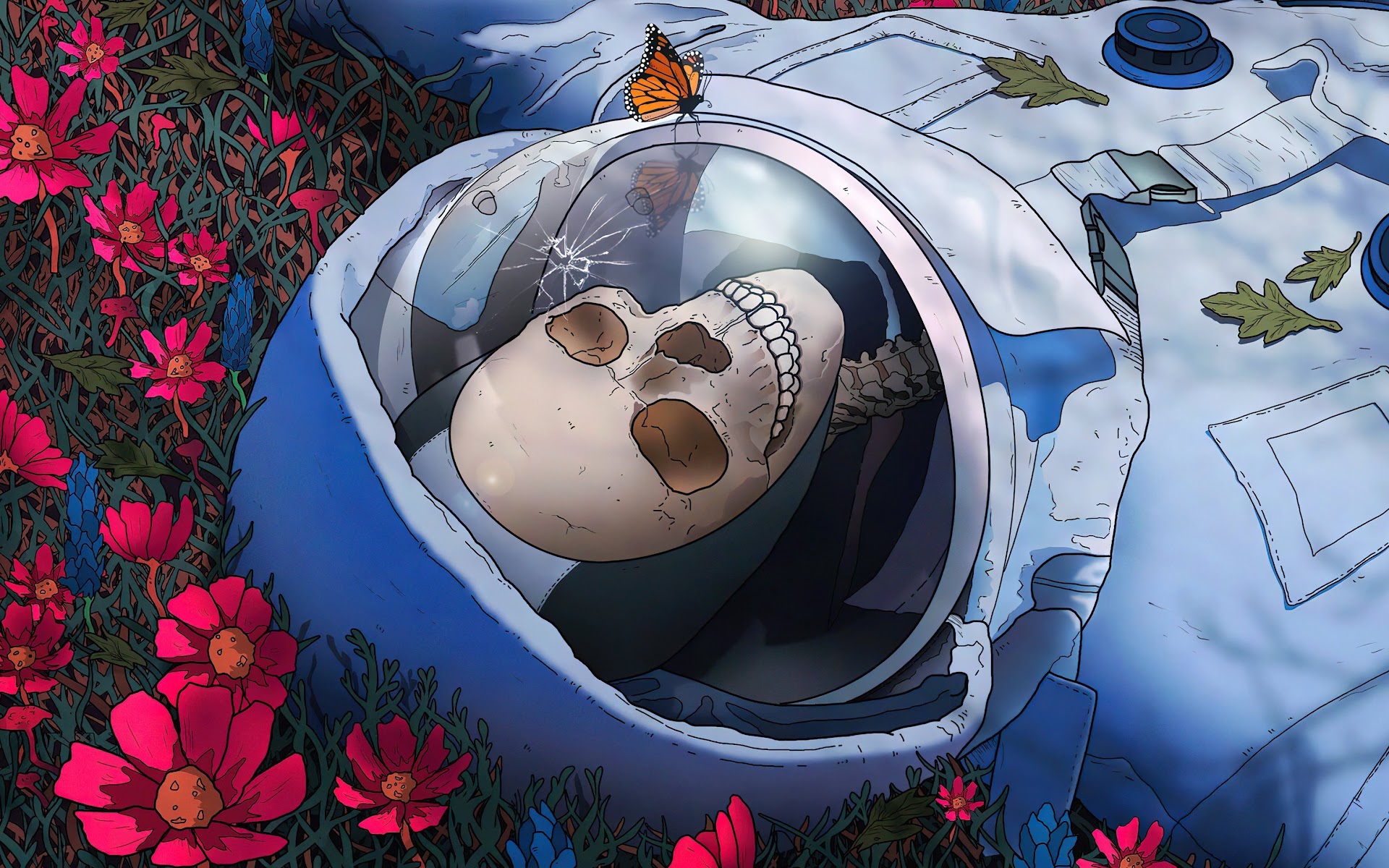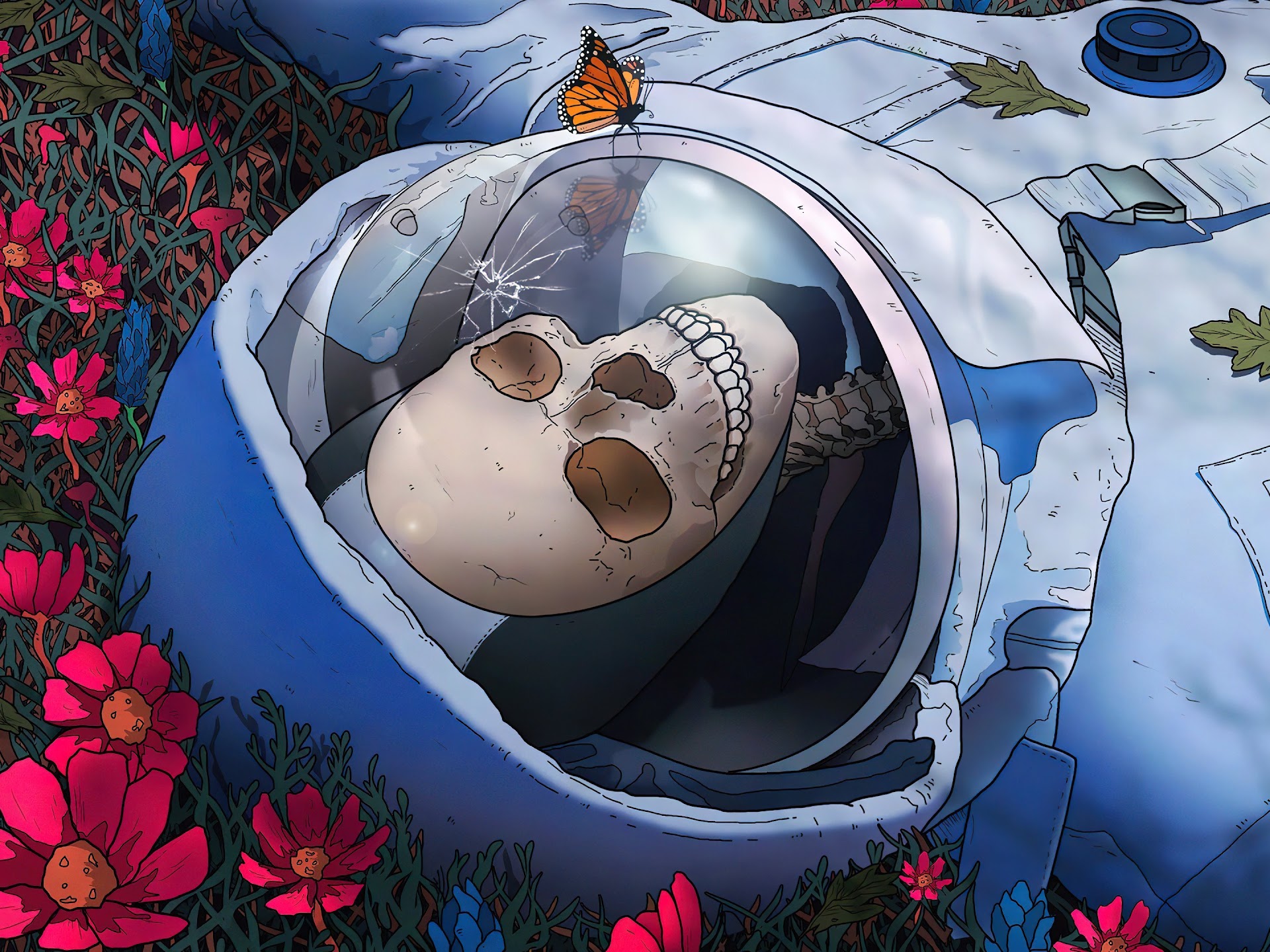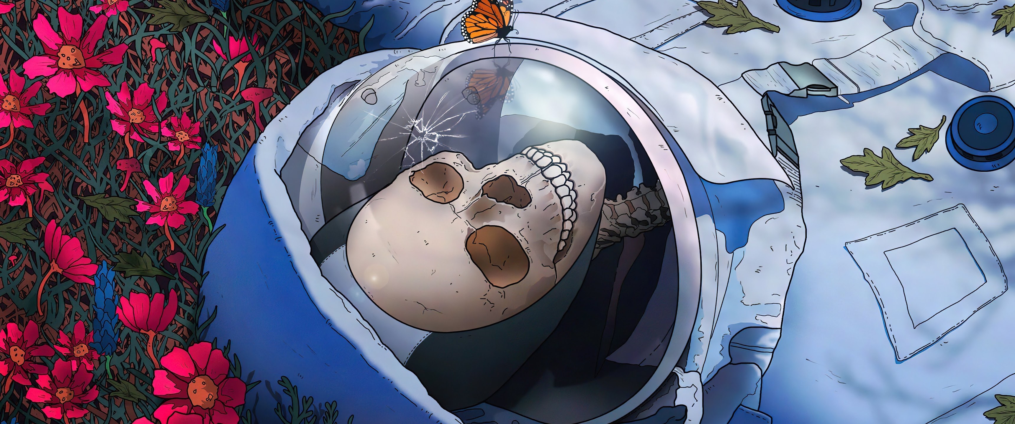 Astronaut, Skeleton, Flowers, Butterfly, Lying On Back 4K Wallpaper Background with a maximum resolution of 3840x2160 px.