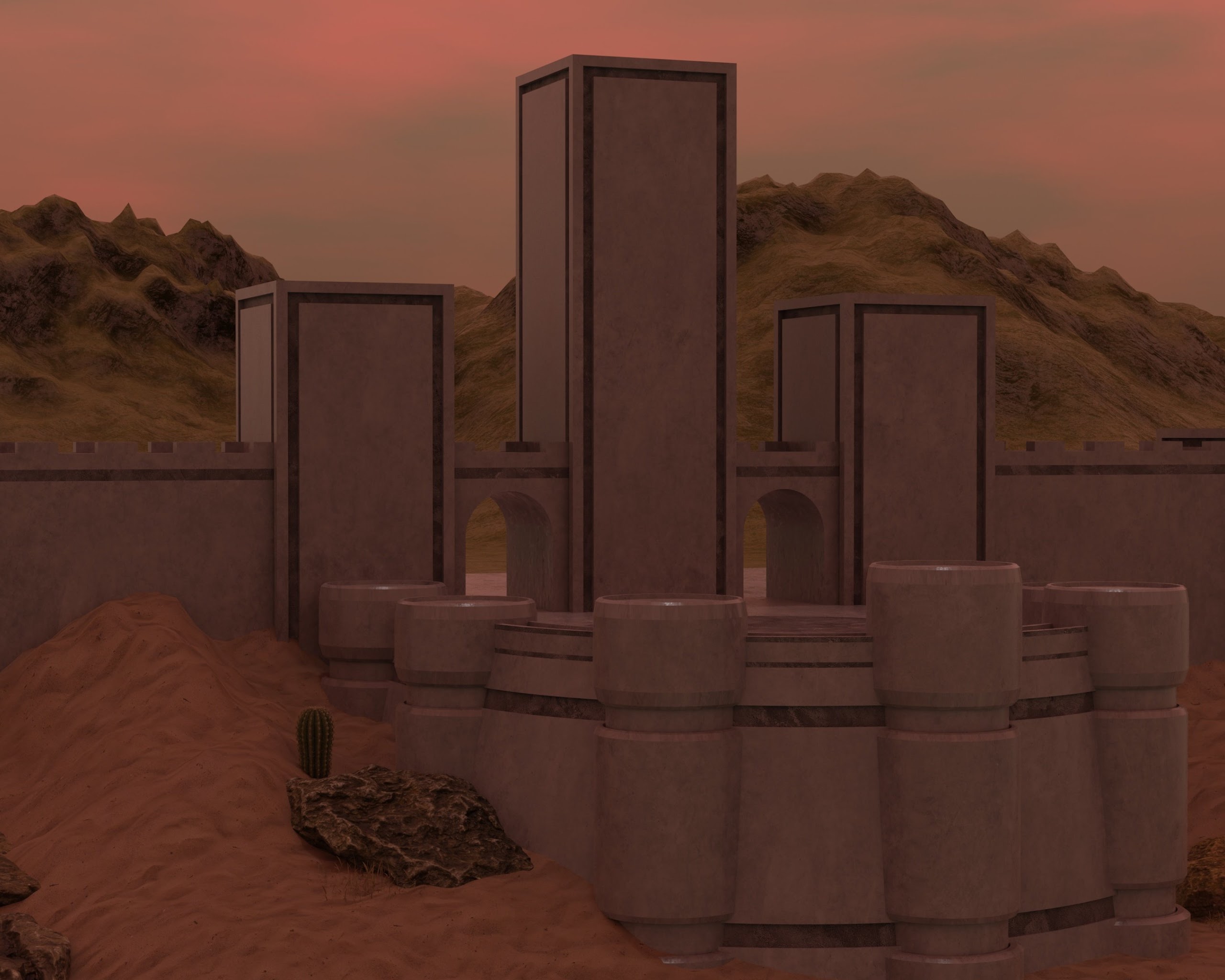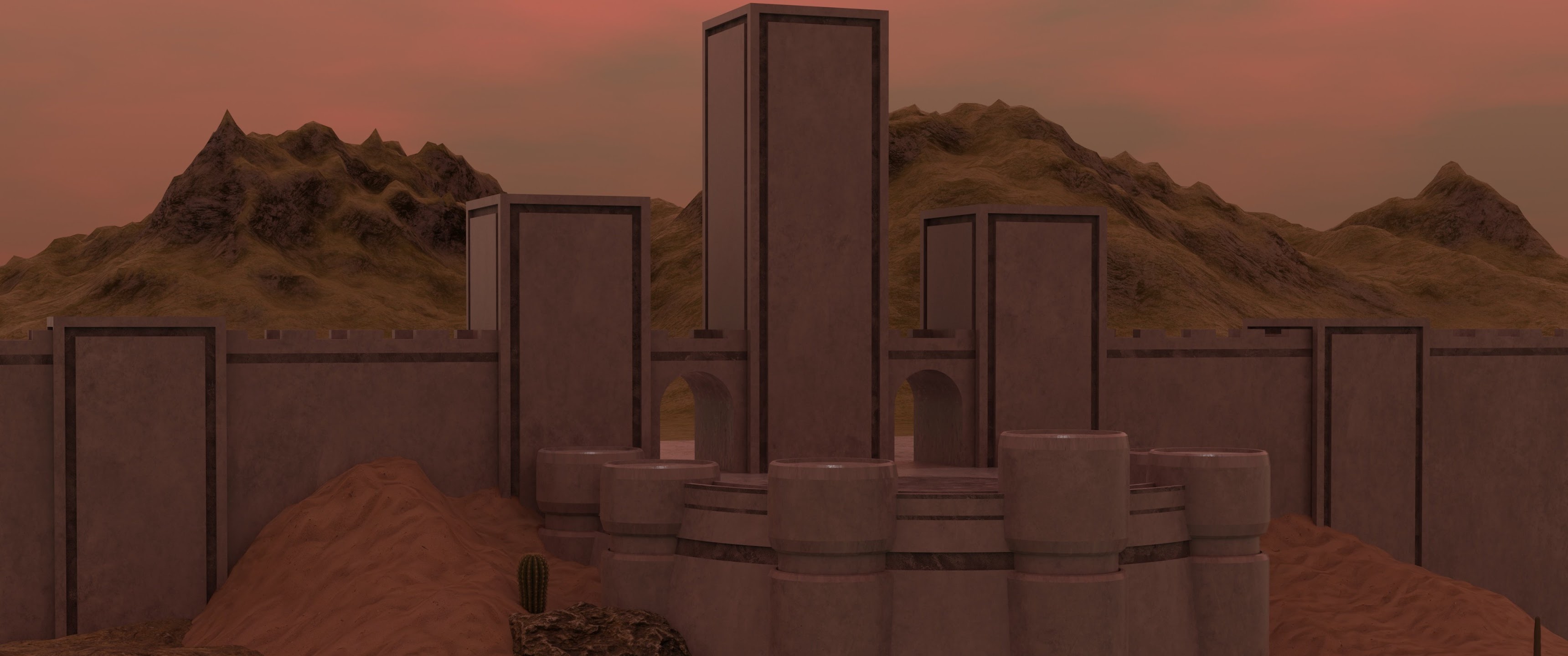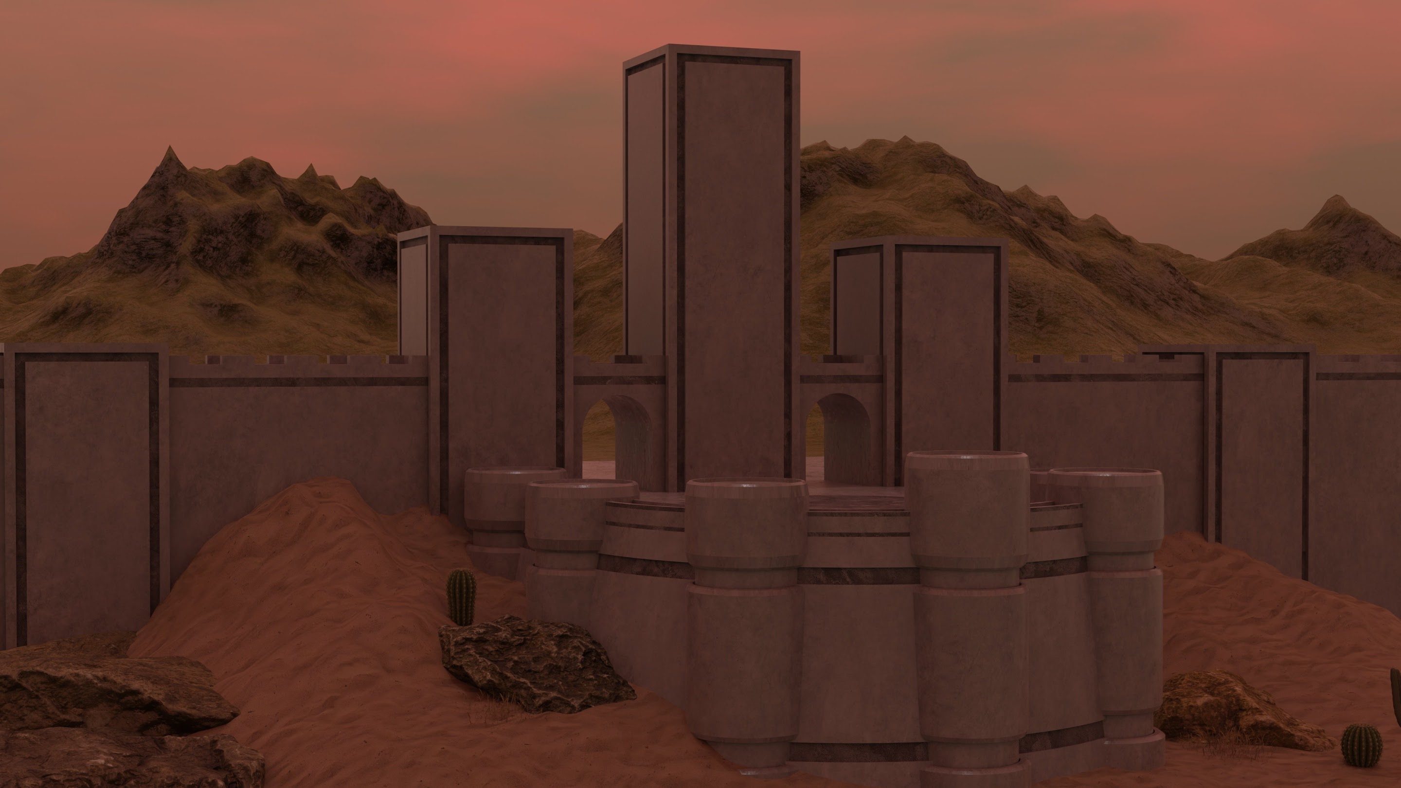 Blender, Building, Digital Art, Sand, Cactus 4K Wallpaper Background with a maximum resolution of 4096x2160 px.