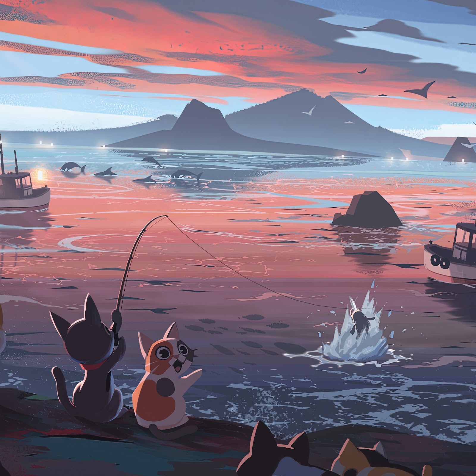 Cats, Fishing, Coastal, Dolphin, Sunset 8K Wallpaper Background with a maximum resolution of 7680x4320 px.