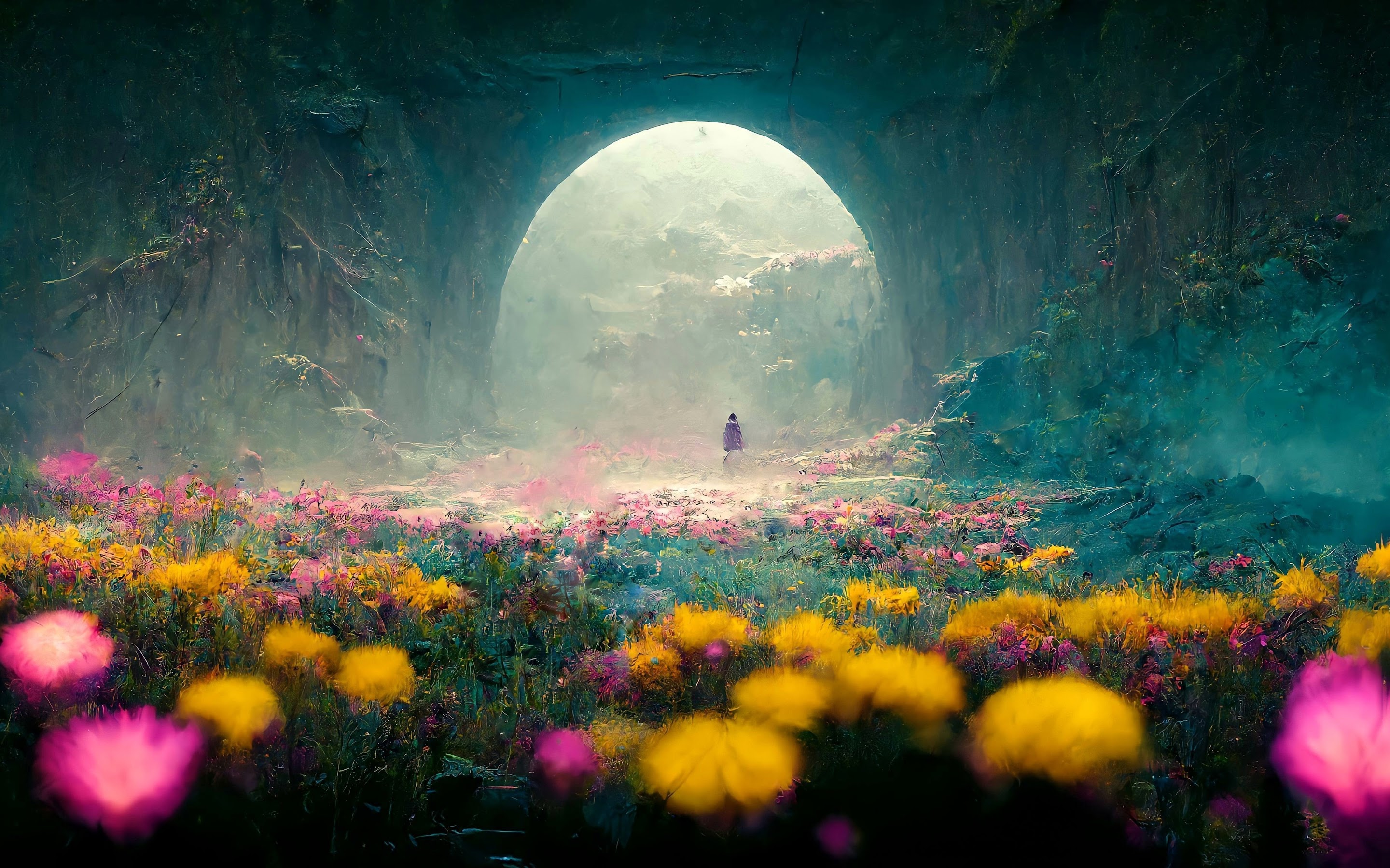 Cave, Flowers, Plants, Pink Flowers, Yellow Flowers 4K Wallpaper Background with a maximum resolution of 4096x2304 px.