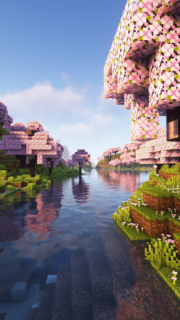 Cherry Blossom, Water, Minecraft, Video Games, Cube 4K Wallpaper Background with a maximum resolution of 3840x2160 px.