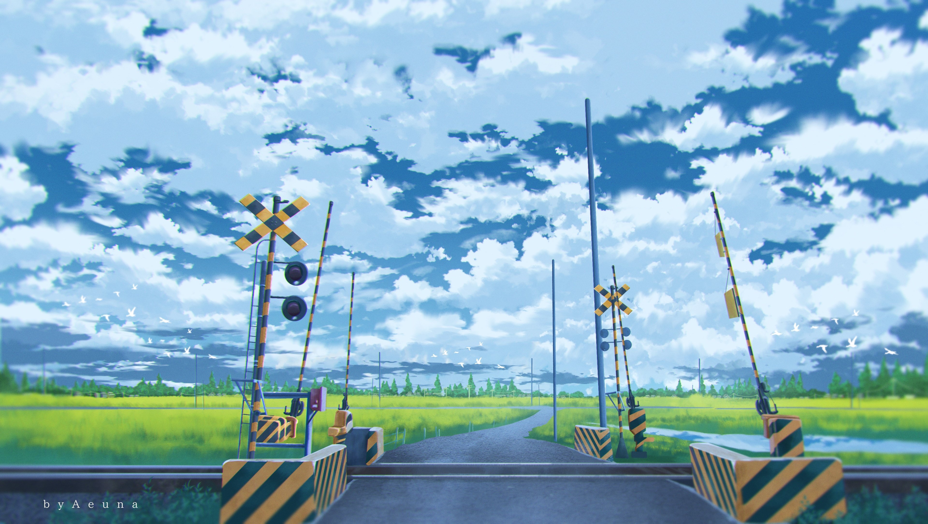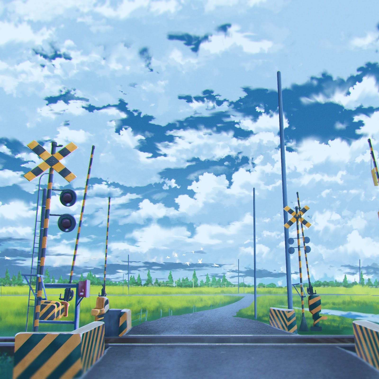 Digital Art, Artwork, Illustration, Clouds, Railway Crossing 4K Wallpaper Background with a maximum resolution of 3840x2168 px.