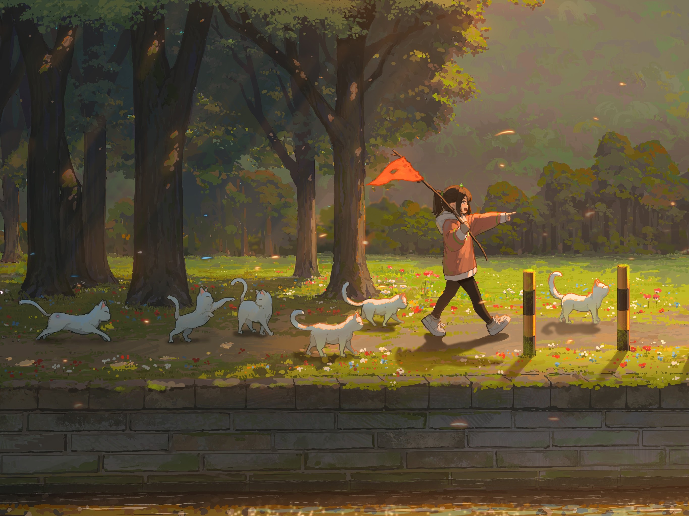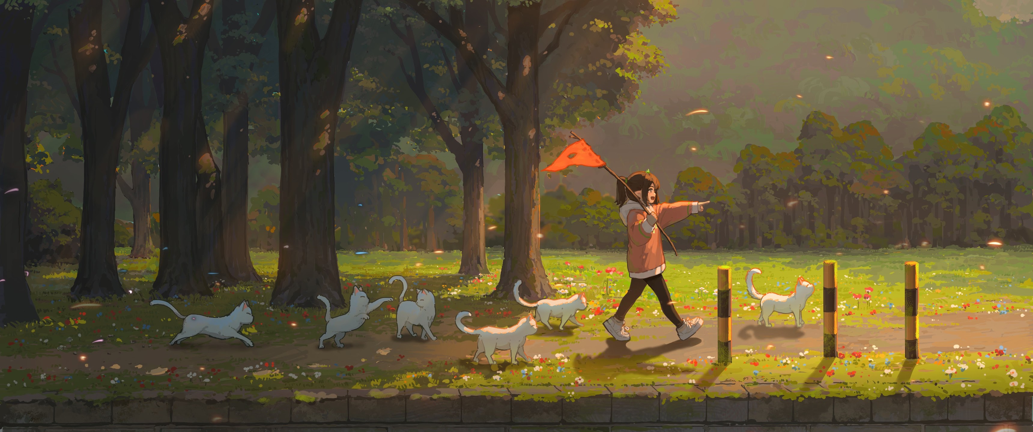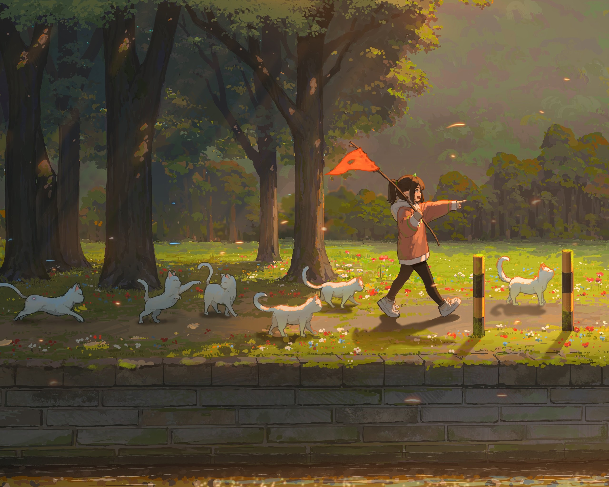 Hua Ming Wink, Original Characters, Illustration, Anime Girls, Cats 5K Wallpaper Background with a maximum resolution of 5263x2961 px.