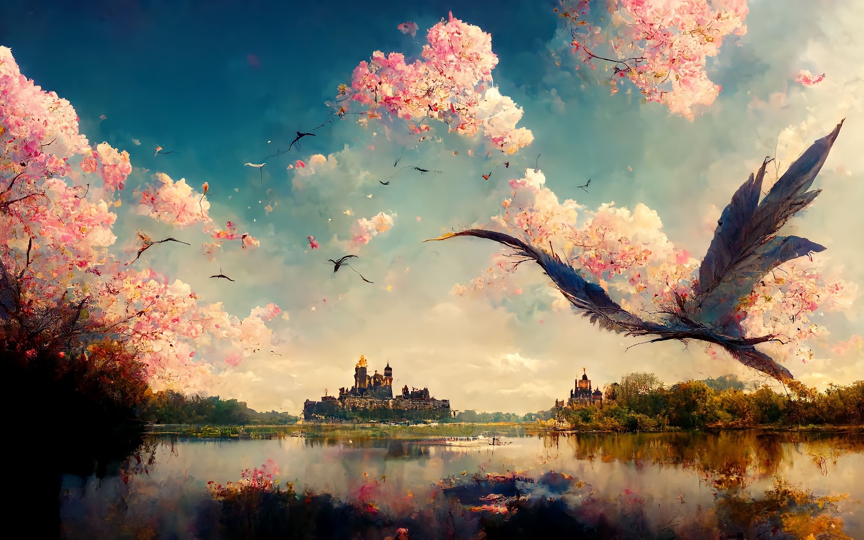Landscape, Blossoms, Castle, Lake, Nature 4K Wallpaper Background with a maximum resolution of 4096x2304 px.