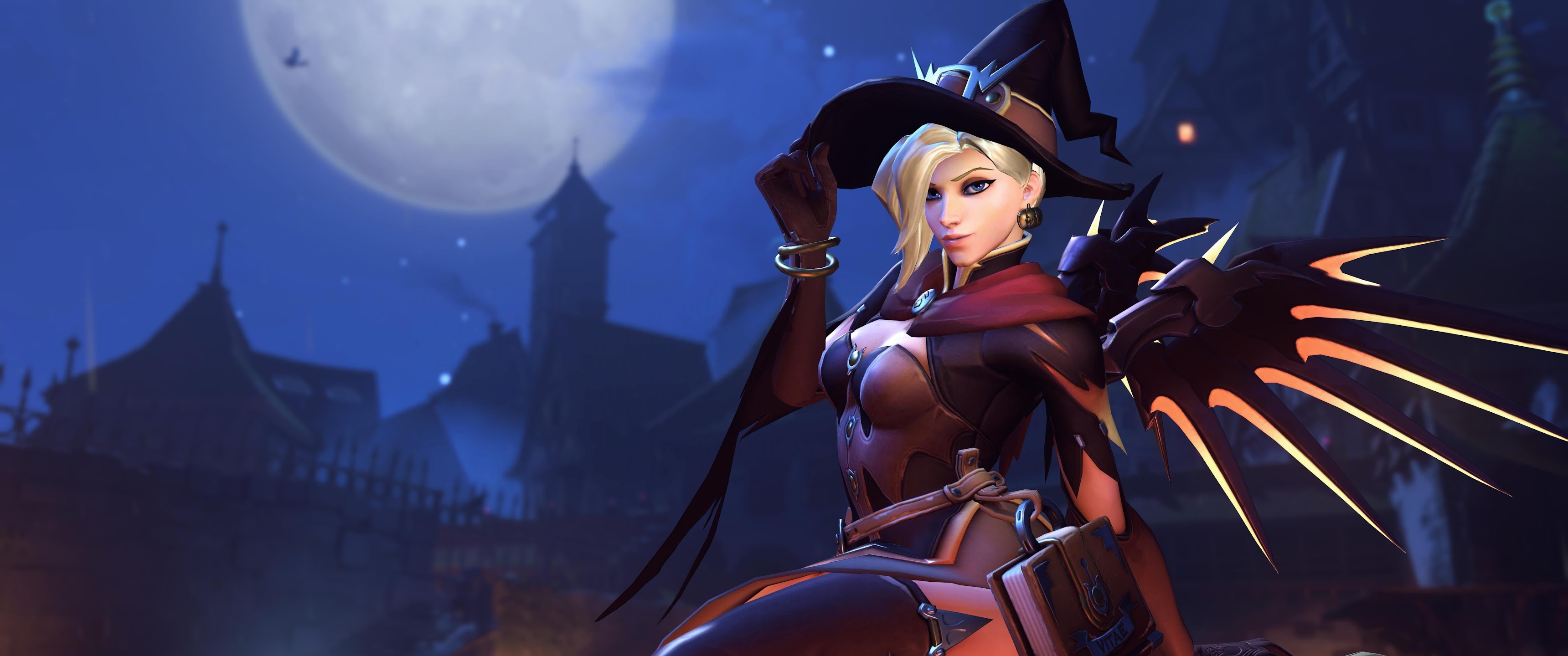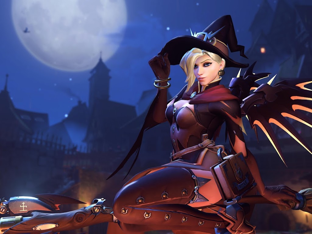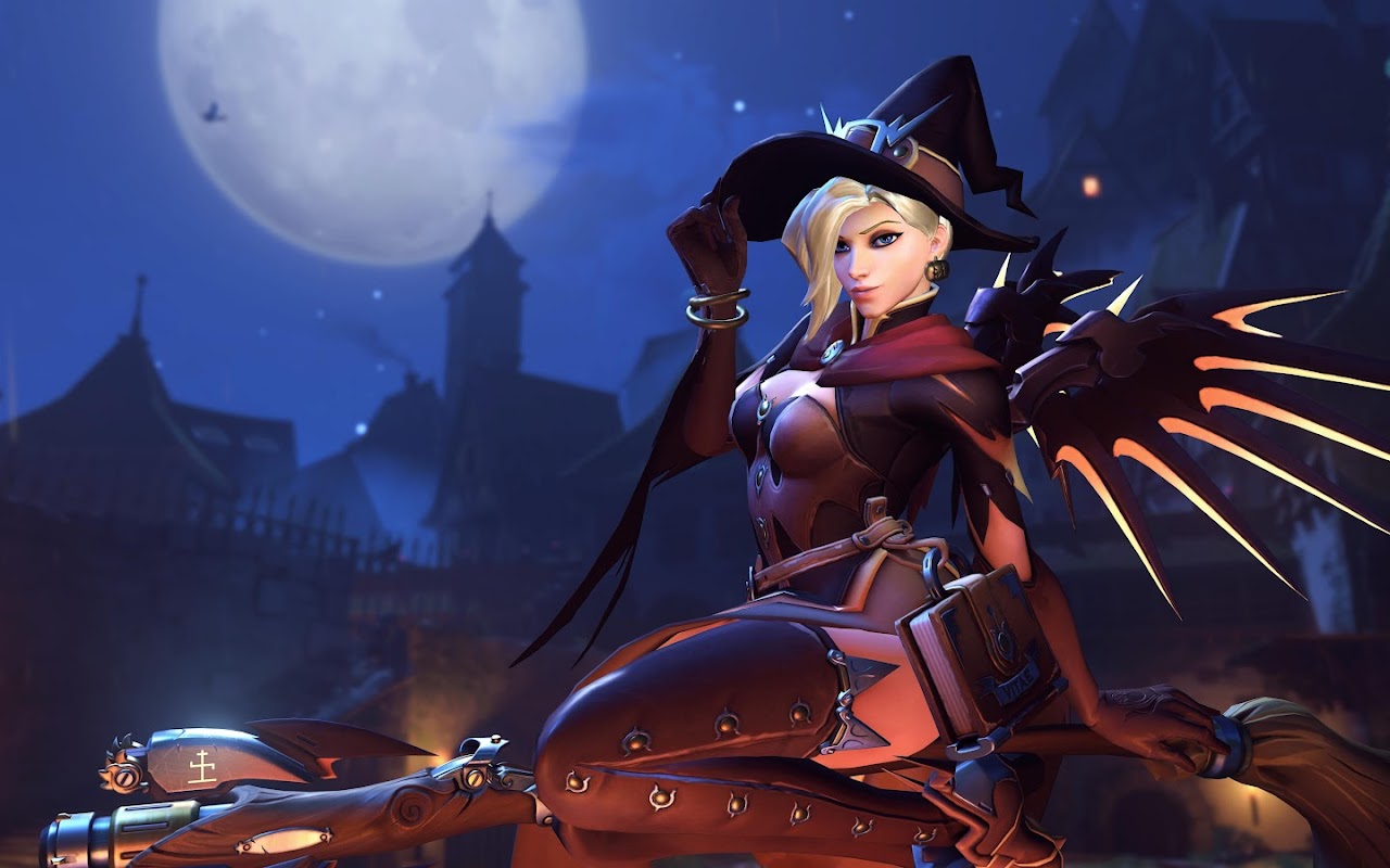 Overwatch, Mercy (Overwatch), Witch, Halloween, Blizzard Entertainment 5K Wallpaper Background with a maximum resolution of 5760x3240 px.