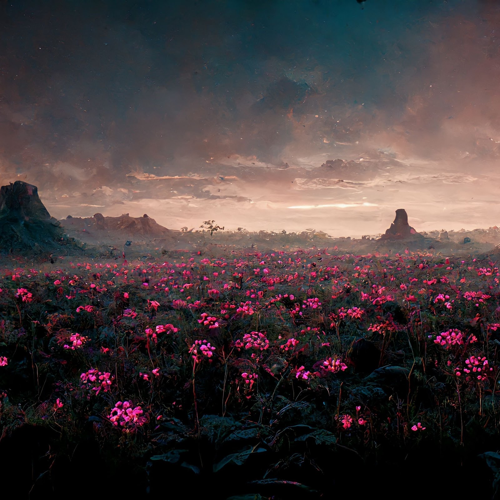 Pink Flowers, Landscape, Mountains, Clouds, Plants 4K Wallpaper Background with a maximum resolution of 4096x2304 px.