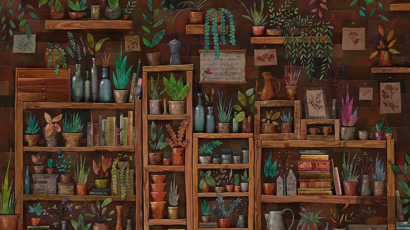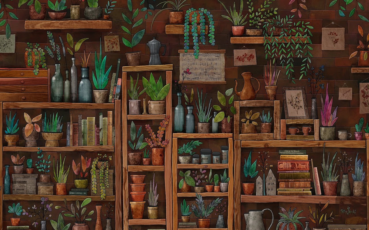 Plants, Flowerpot, Bottles, Artwork, Digital Art 5K Wallpaper Background with a maximum resolution of 5120x2880 px.