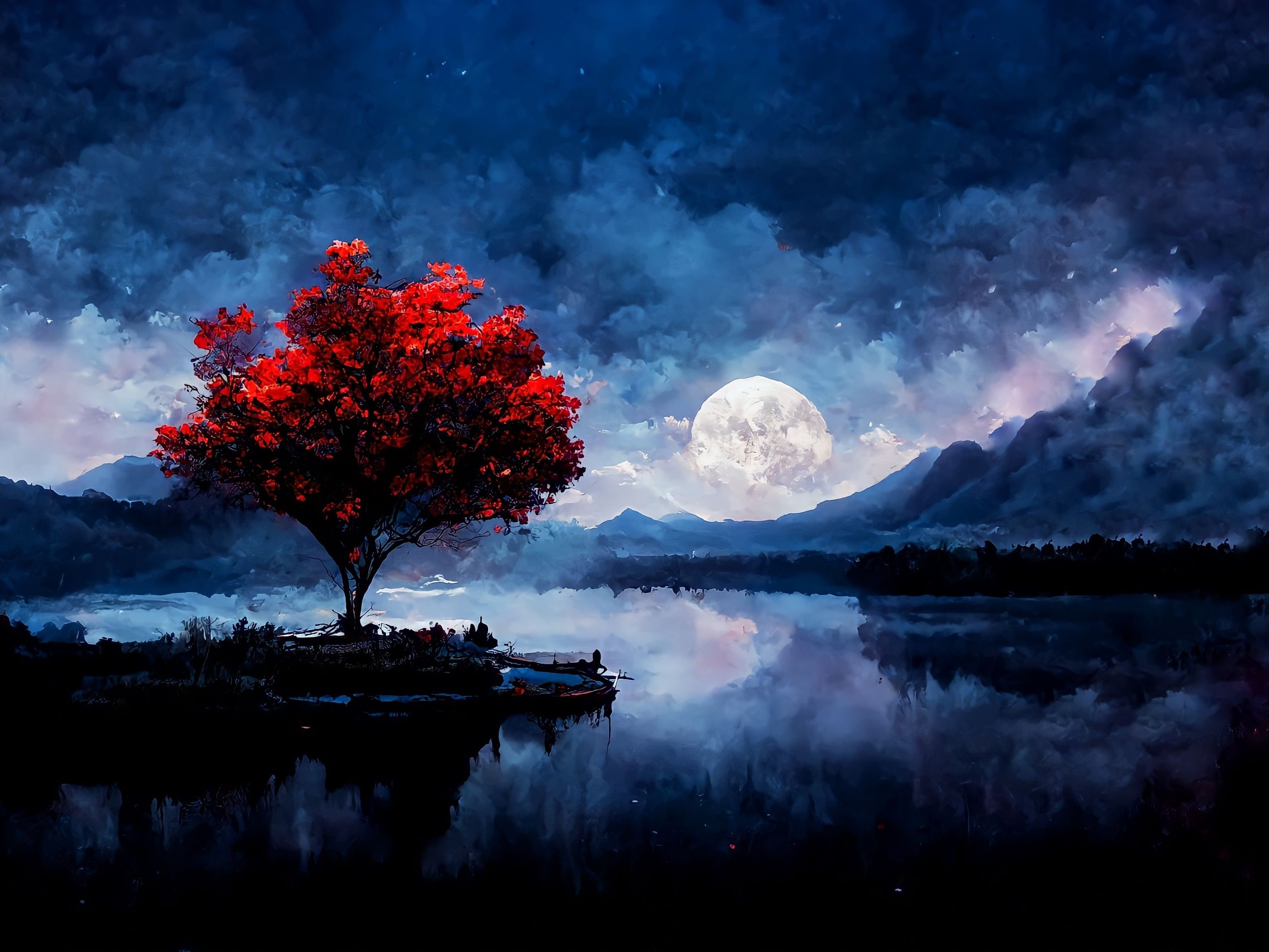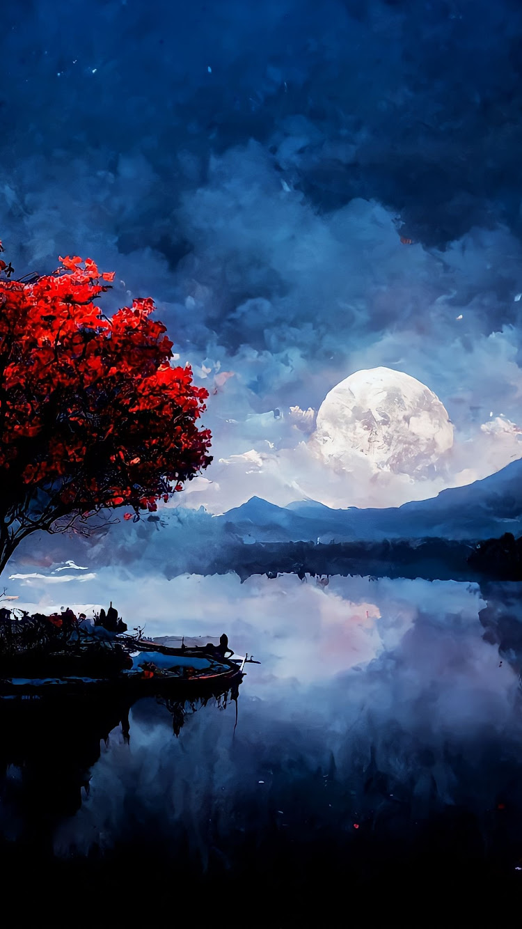 Red Trees, Full Moon, Landscape, Matte Painting, Artstation 4K Wallpaper Background with a maximum resolution of 4096x2304 px.