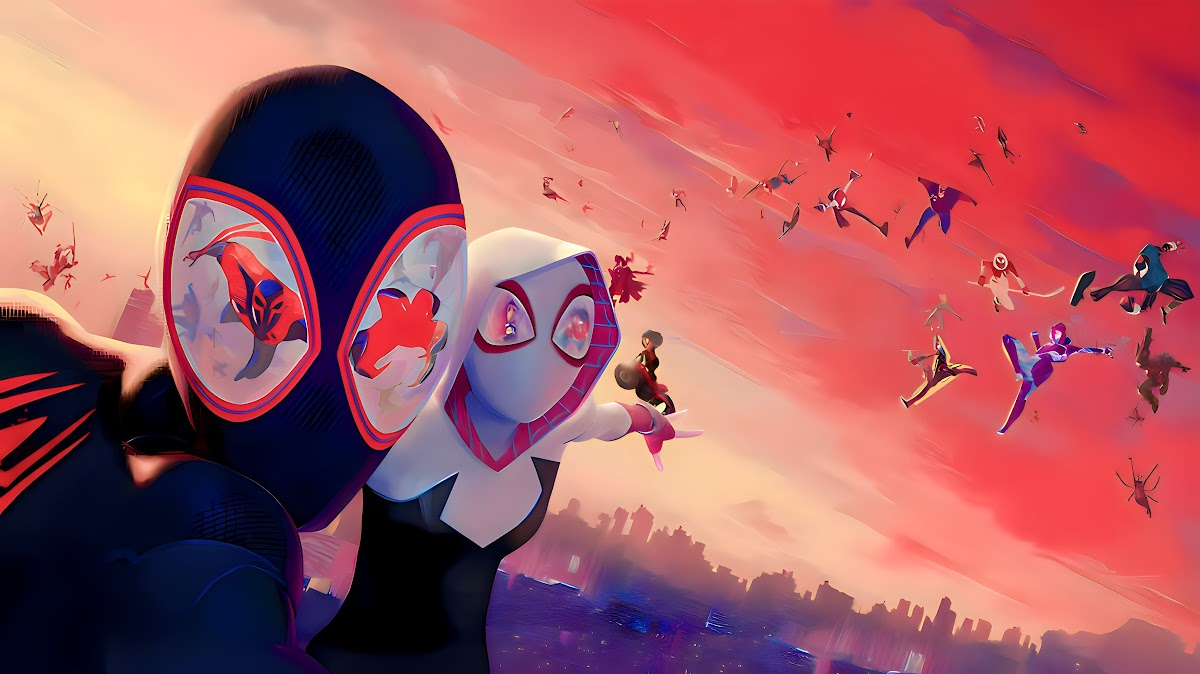 Spider-Man, Spider-Man: Across The Spider-Verse, Avenger, Spider Gwen, Digital Art 4K Wallpaper Background with a maximum resolution of 4096x2300 px.