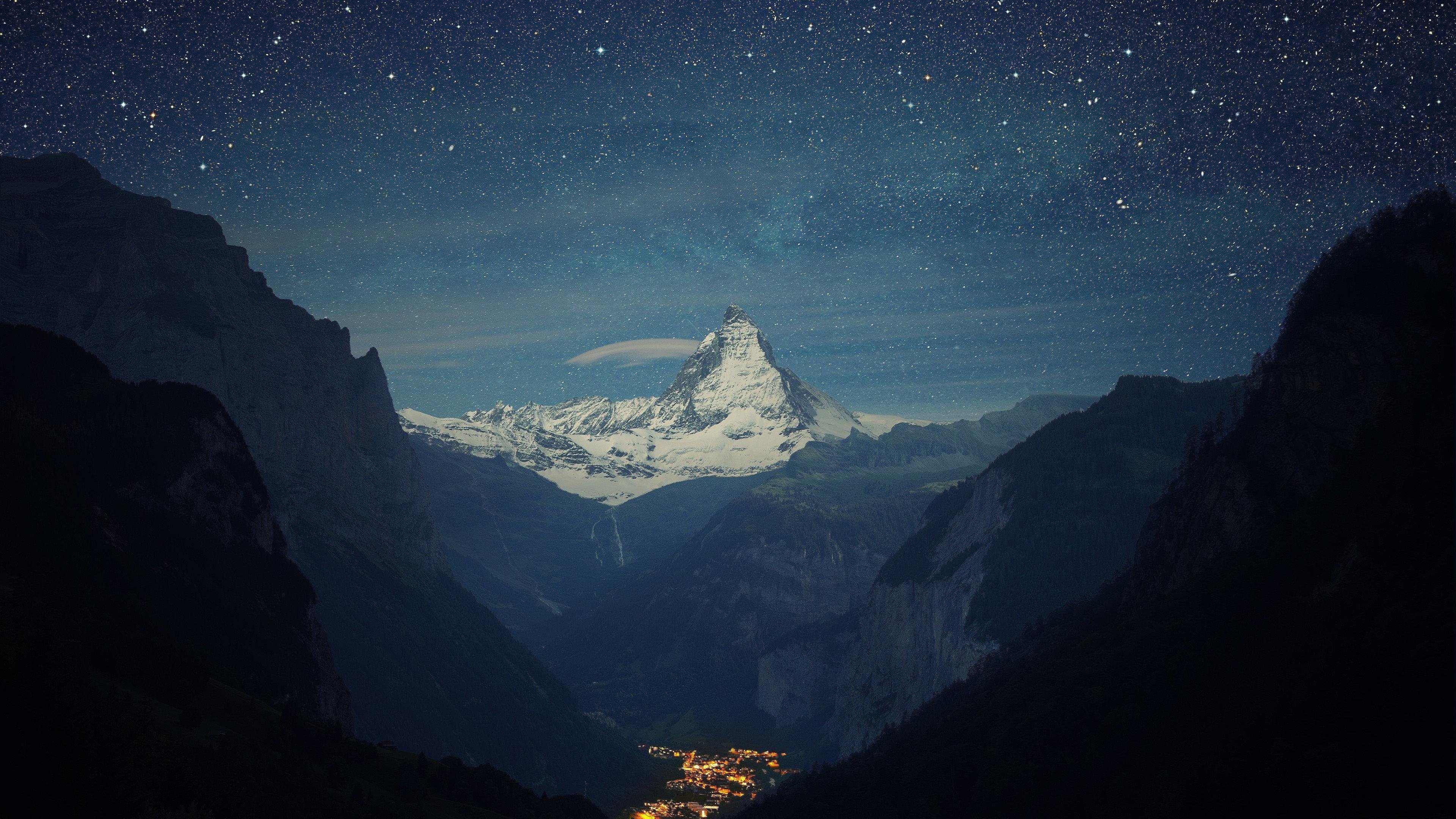 Stars, Space, Clouds, Mountains, Snowy Peak 4K Wallpaper Background with a maximum resolution of 3840x2160 px.