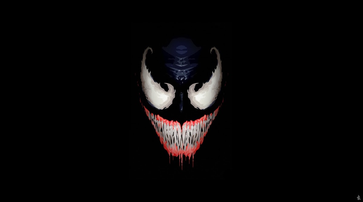 Venom, Artwork, Simple Background, Black Background, Smiling 5K Wallpaper Background with a maximum resolution of 6800x3800 px.