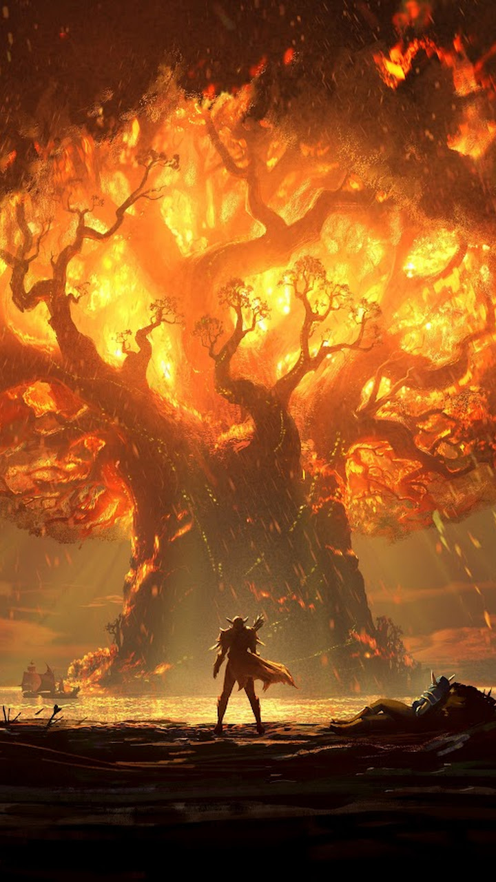 Video Games, Warcraft, Alliance, Teldrassil, Fire 8K Wallpaper Background with a maximum resolution of 10000x4526 px.