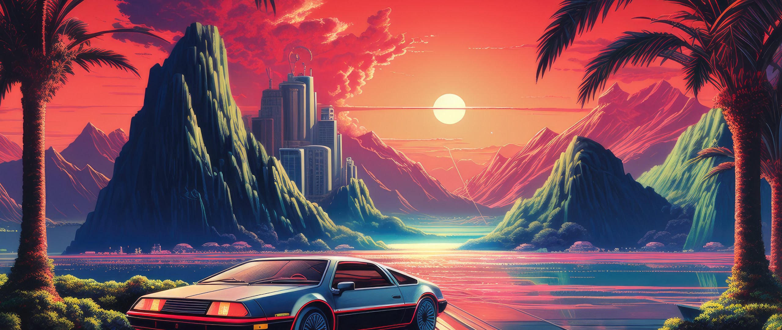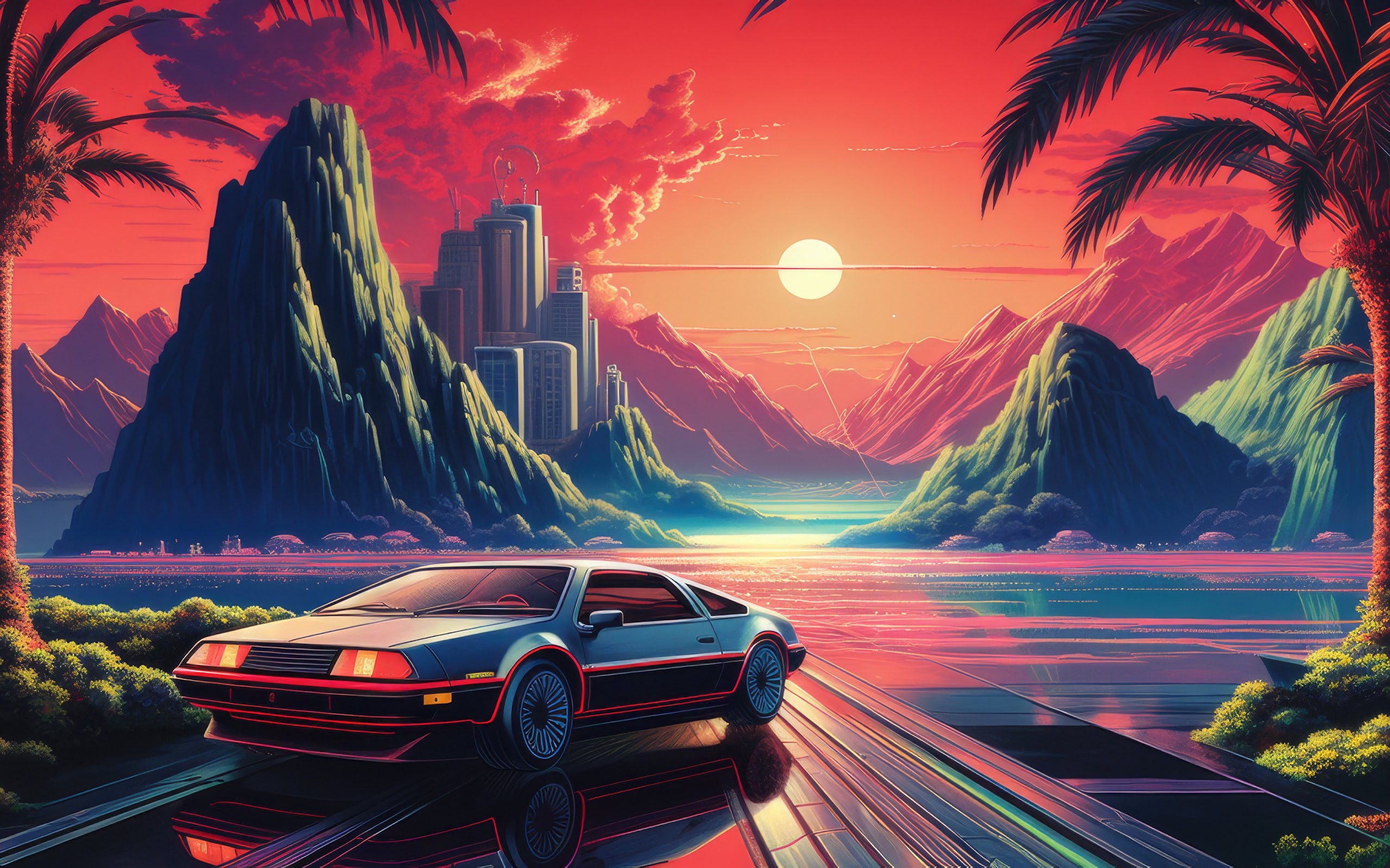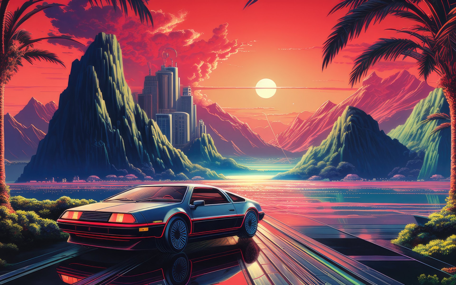Synthwave, DeLorean, Outrun, Retrowave 4K Desktop Wallpaper