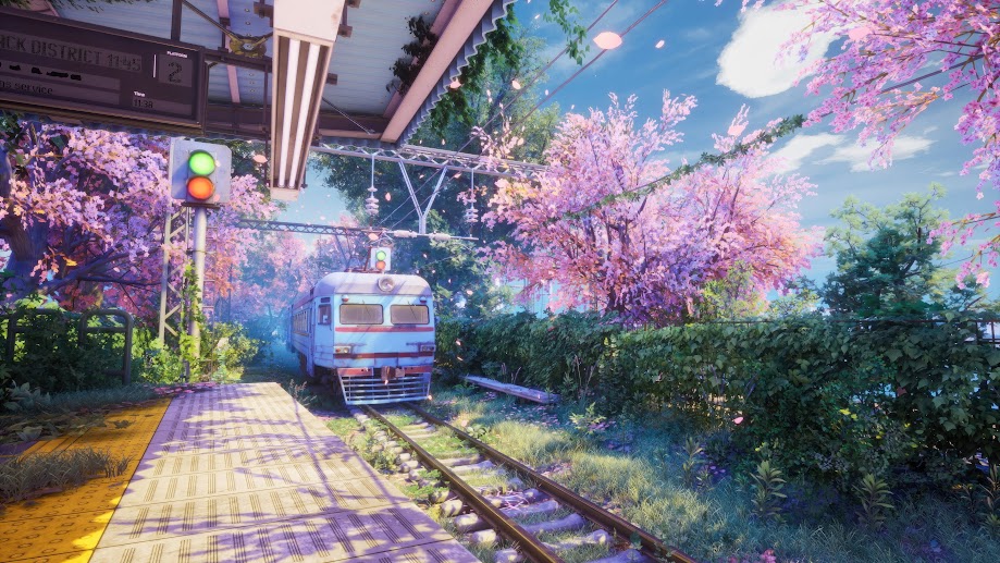 Aesthetic, Sakura, Train, Station, Overgrown 4K Desktop Wallpaper