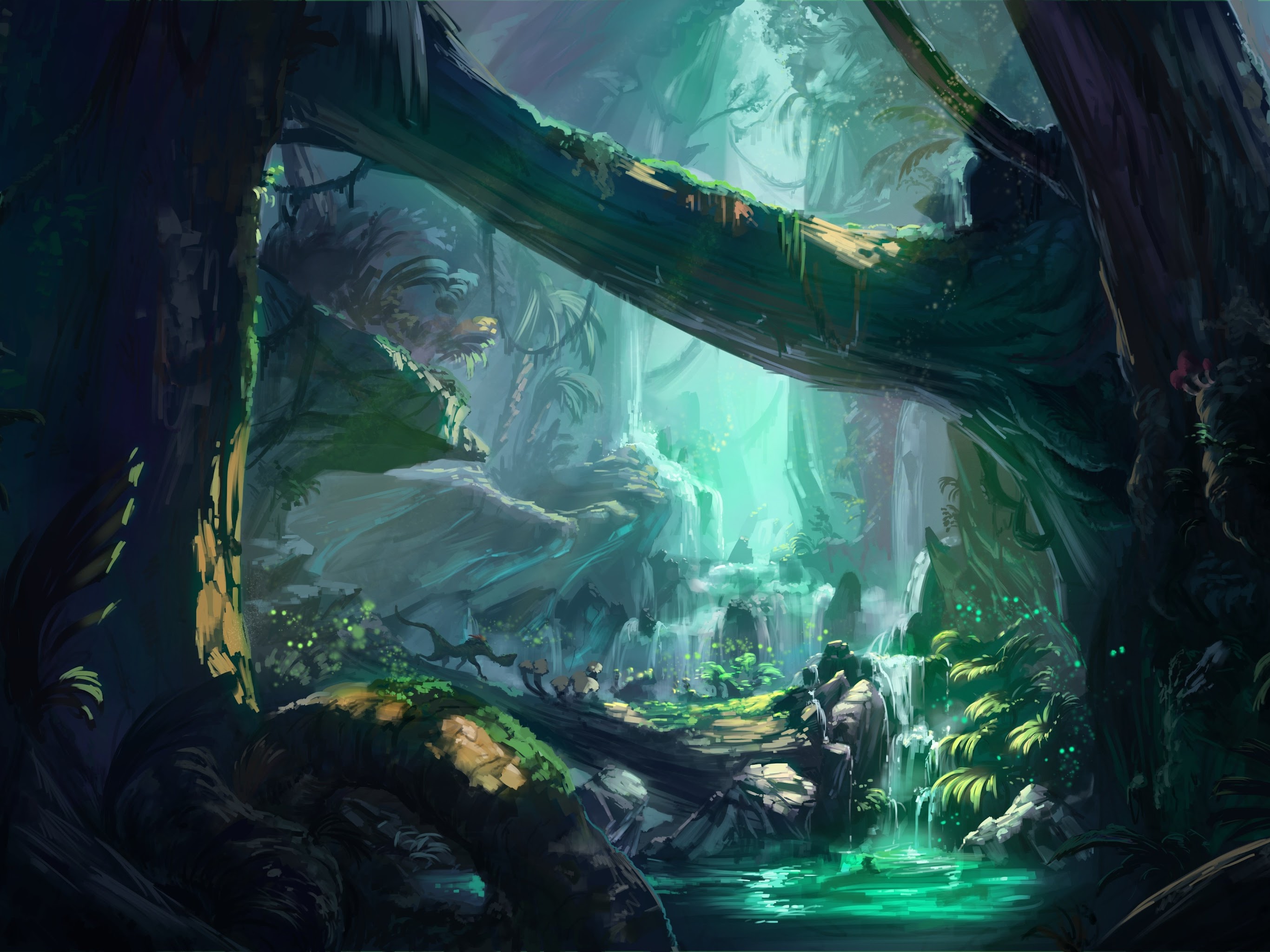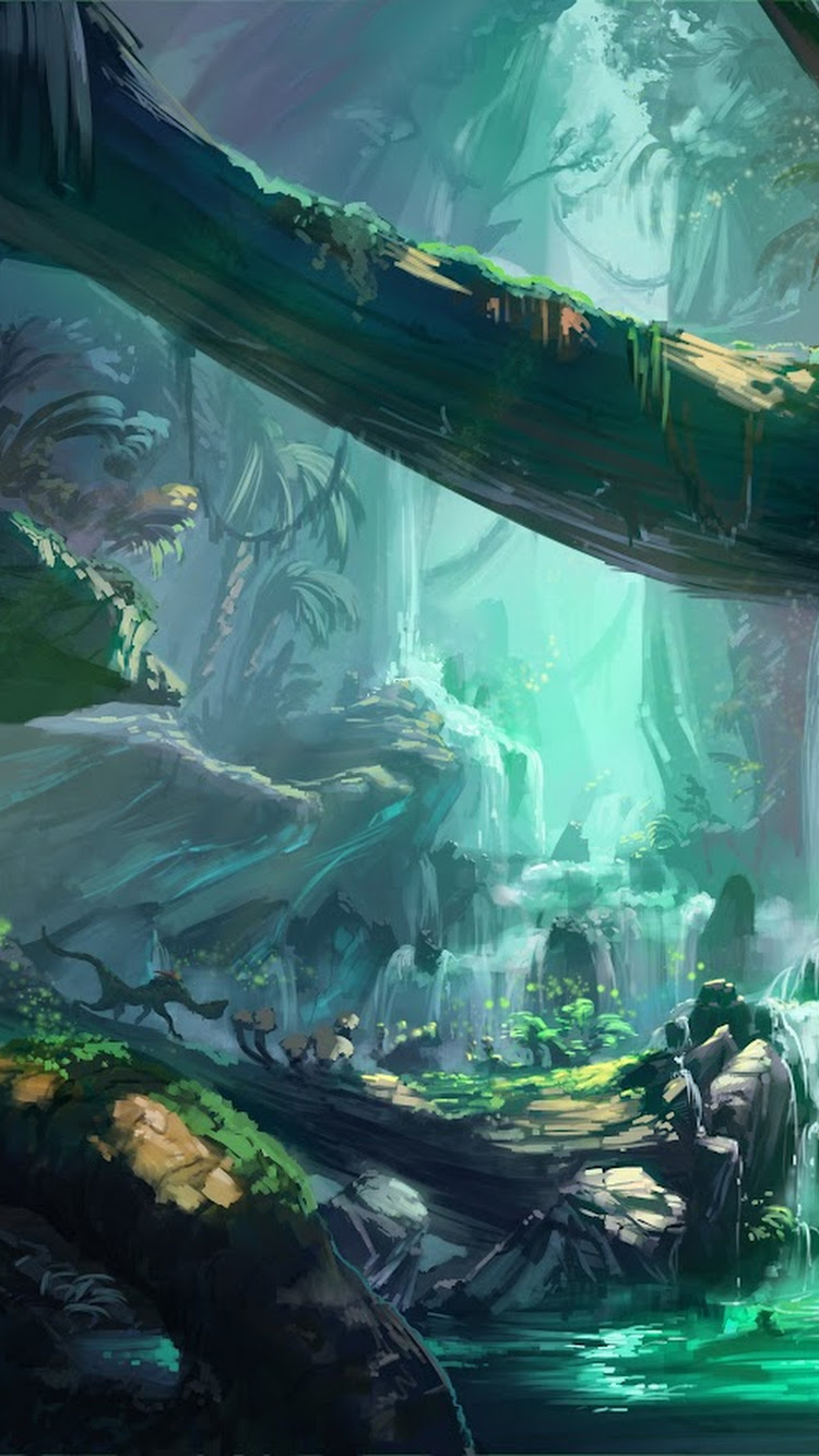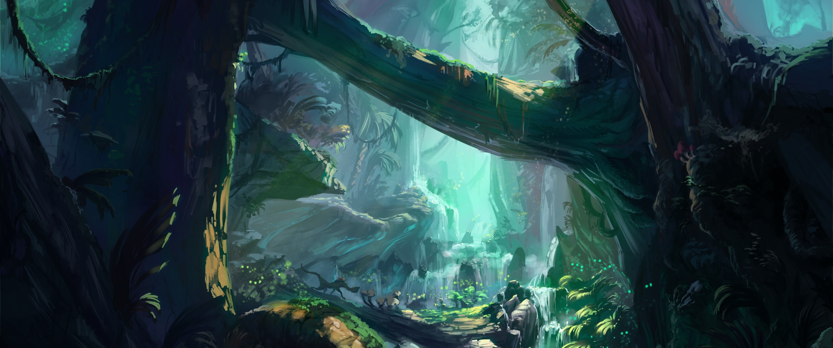 Ancient, Fantasy Art, Trees, Waterfall, River 4K Desktop Wallpaper Background with a maximum resolution of 5000x2750 px.