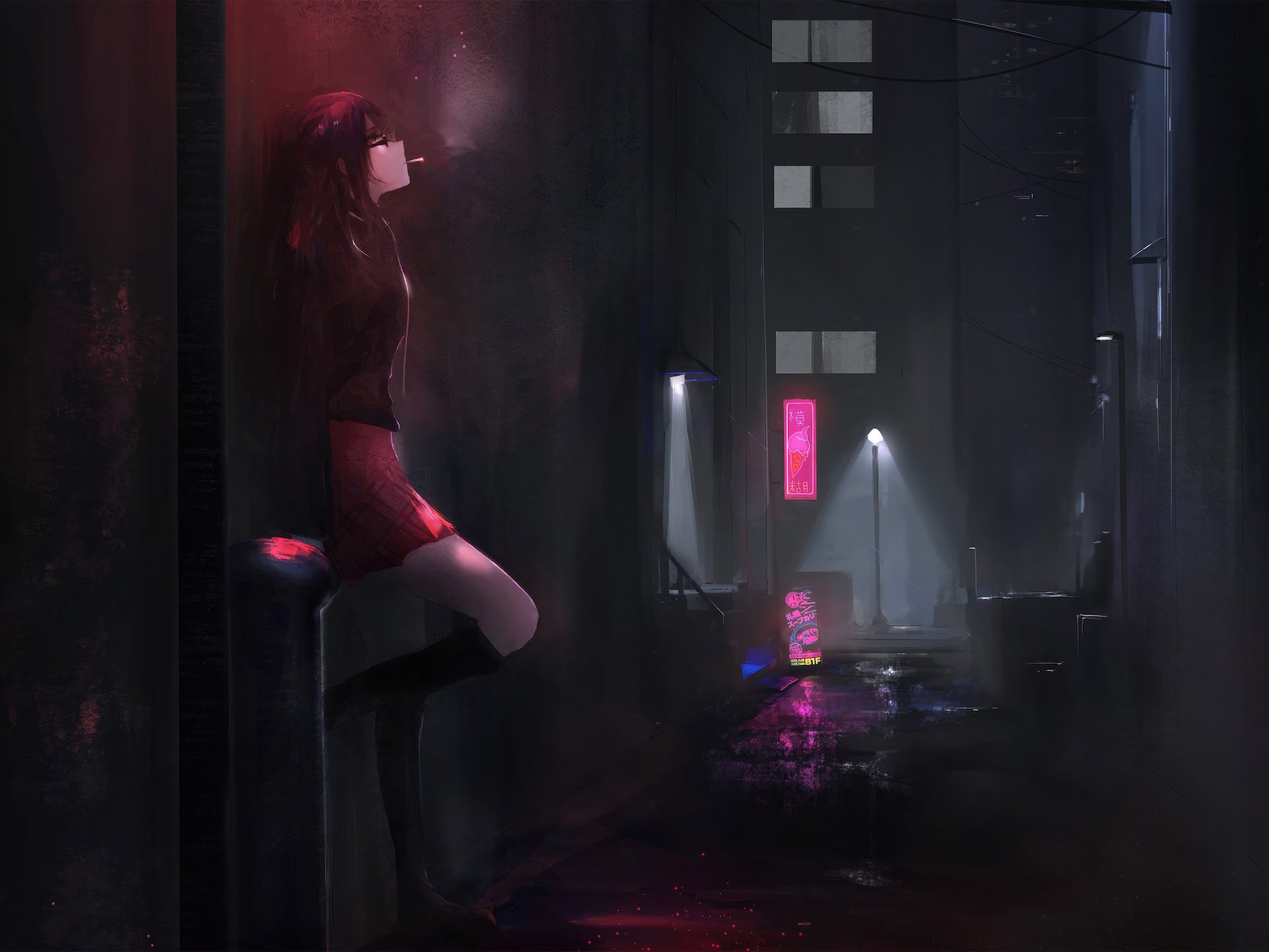 Anime, Alleyway, Smoking, Neon 4K Desktop Wallpaper