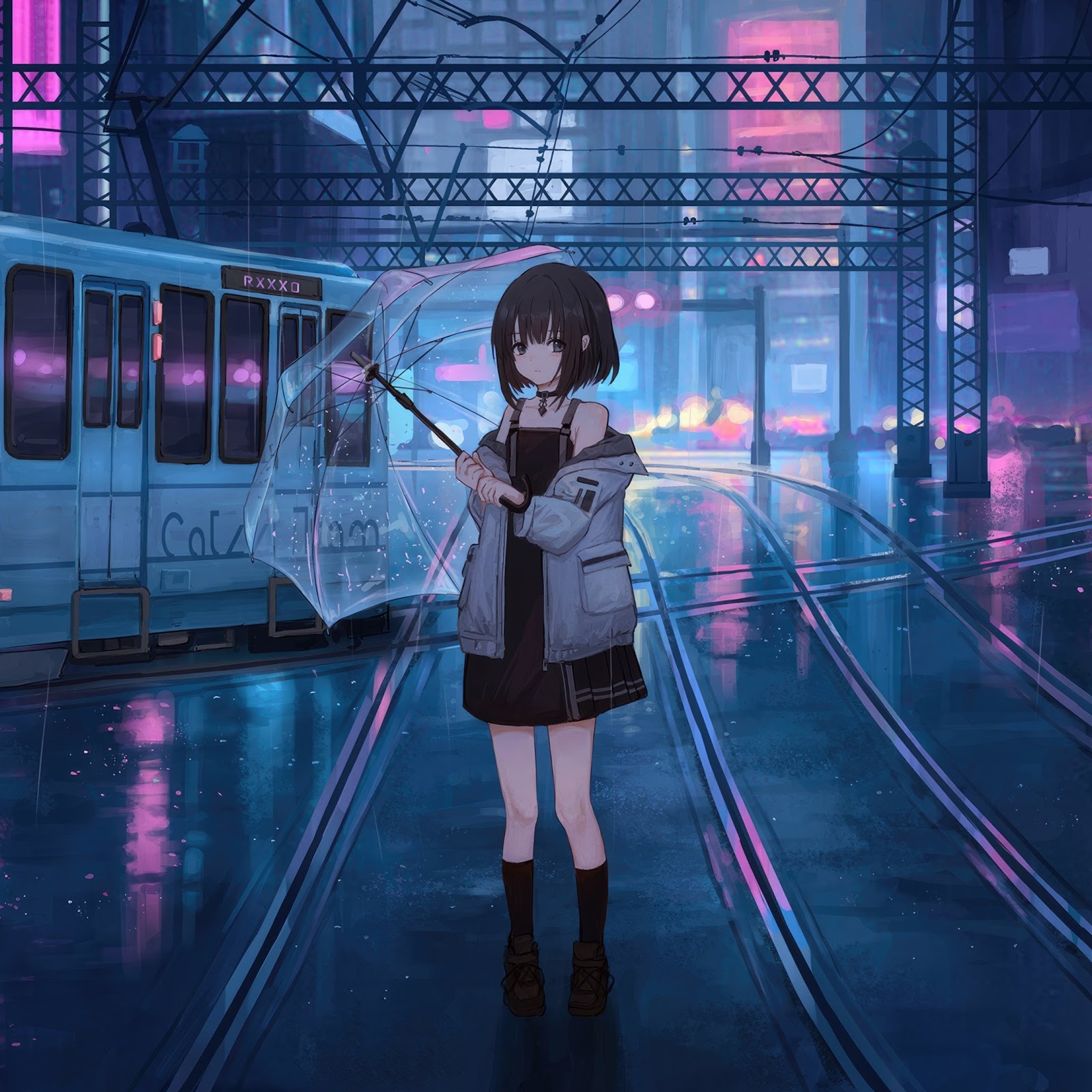 Anime Girl With Umbrella Under Neon Lights Tram Passing By 4K Desktop Wallpaper