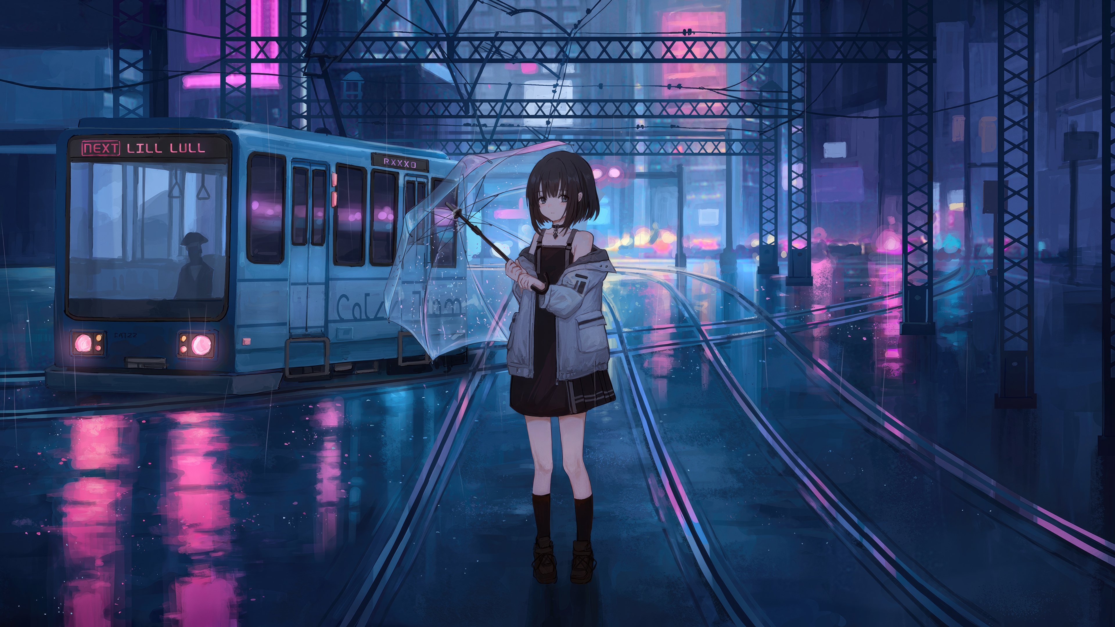 Anime Girl With Umbrella Under Neon Lights Tram Passing By 4K Desktop Wallpaper Background [3840x2160] Free Download