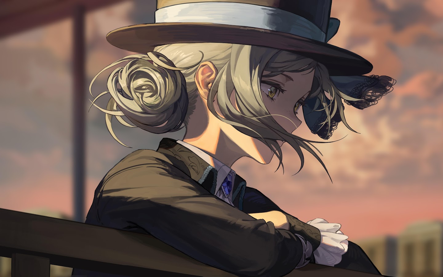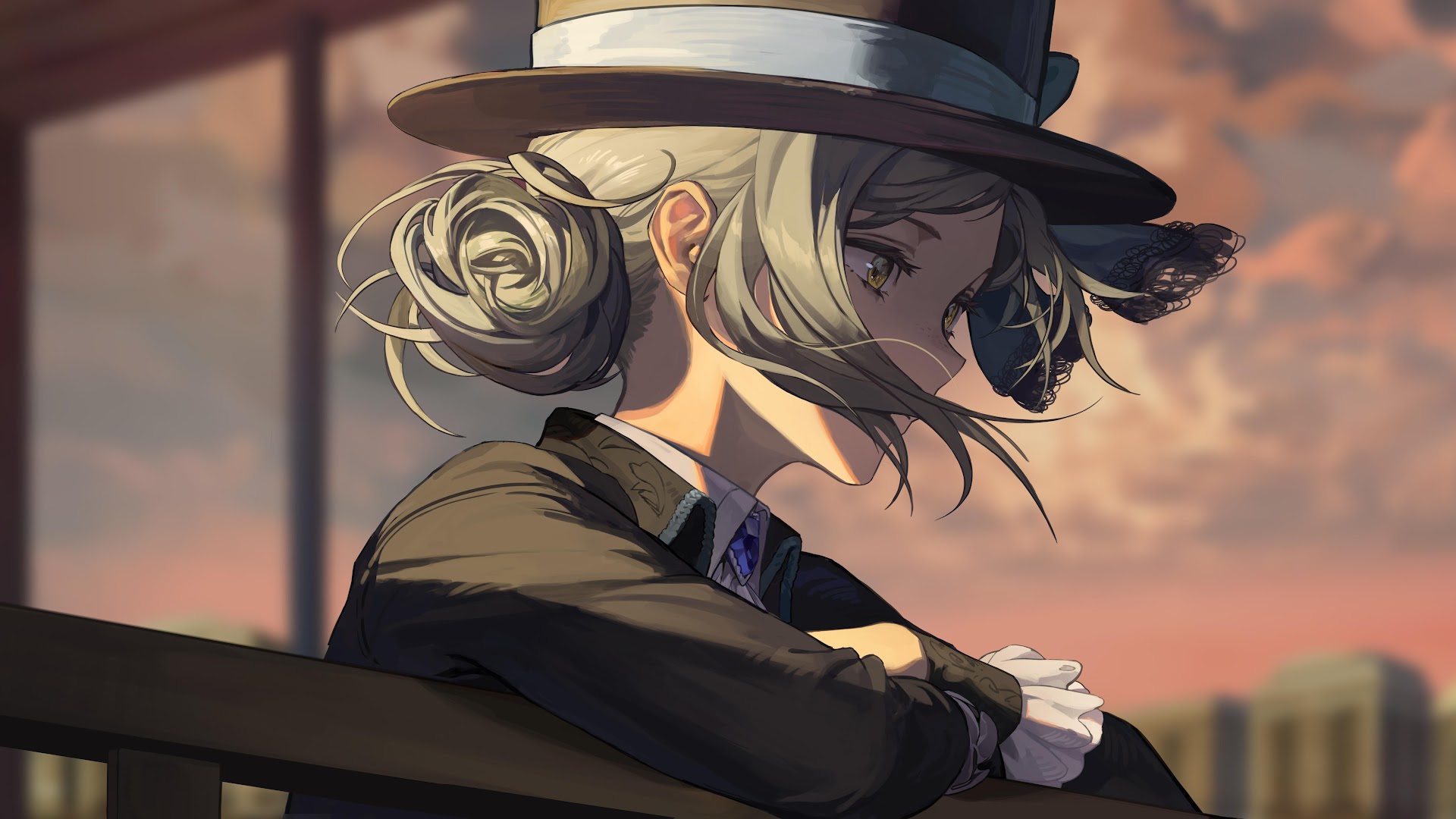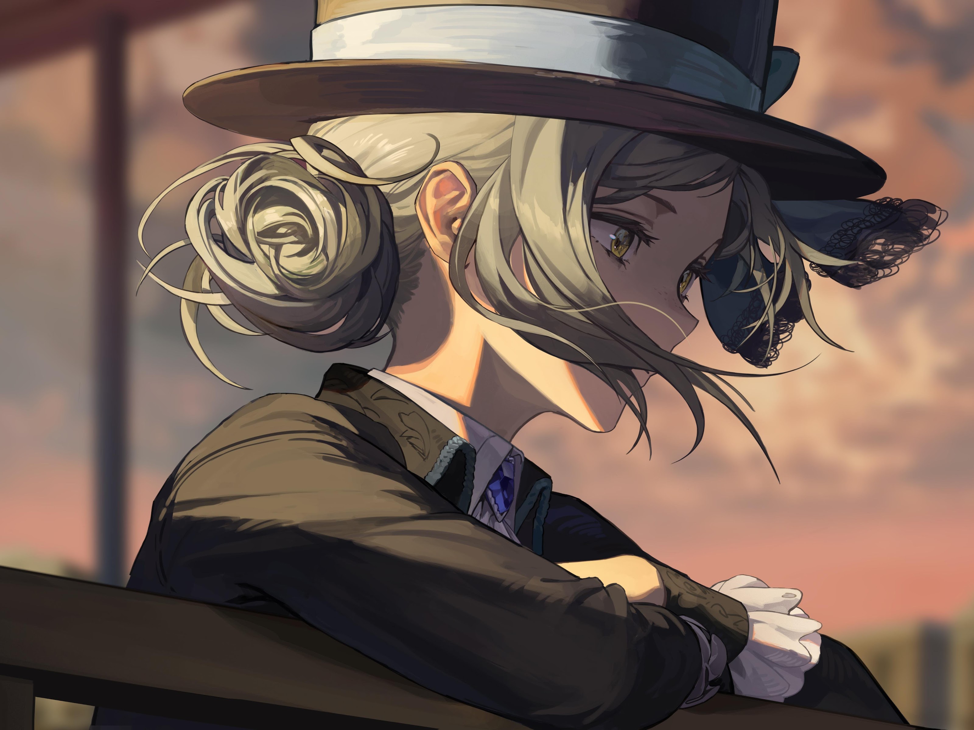 Anime Girls, Silver Hair, Hat, Looking Away, Sunset 5K Desktop Wallpaper