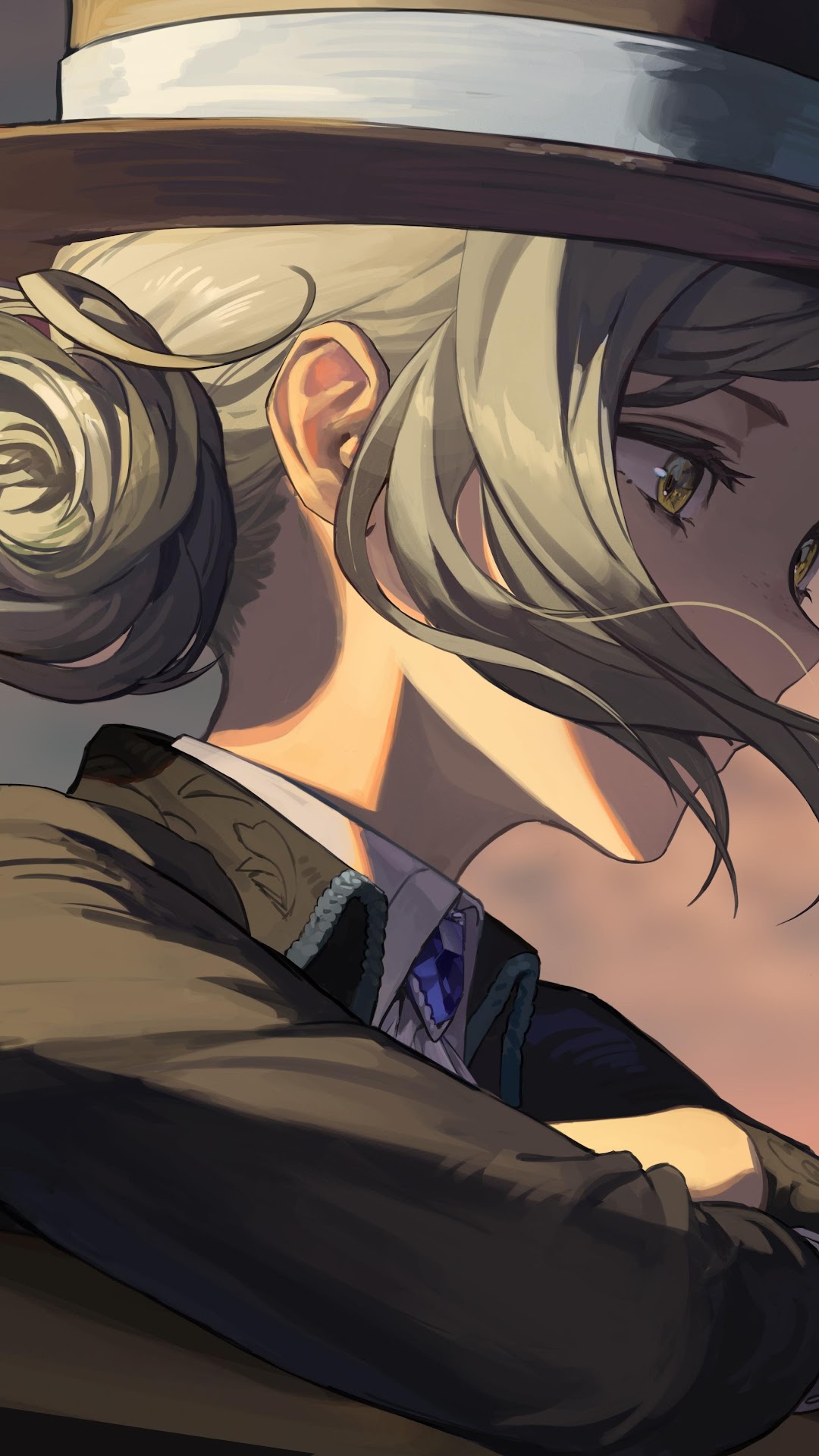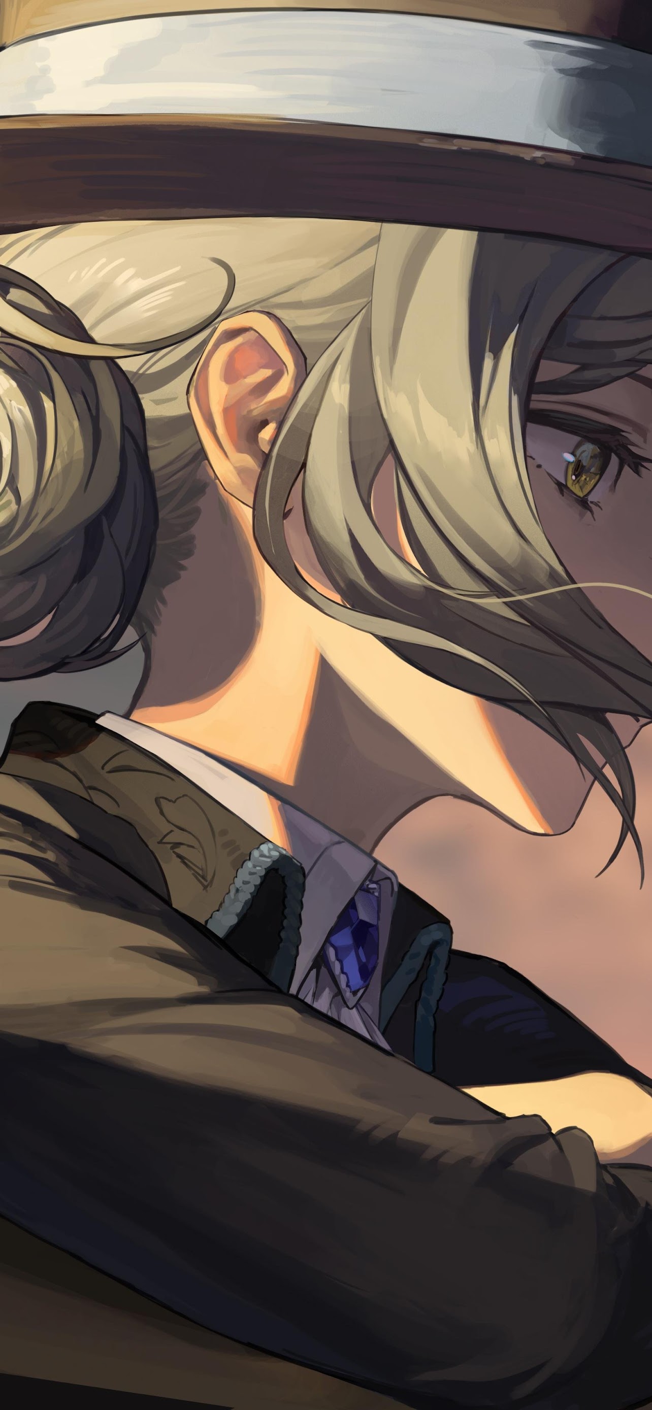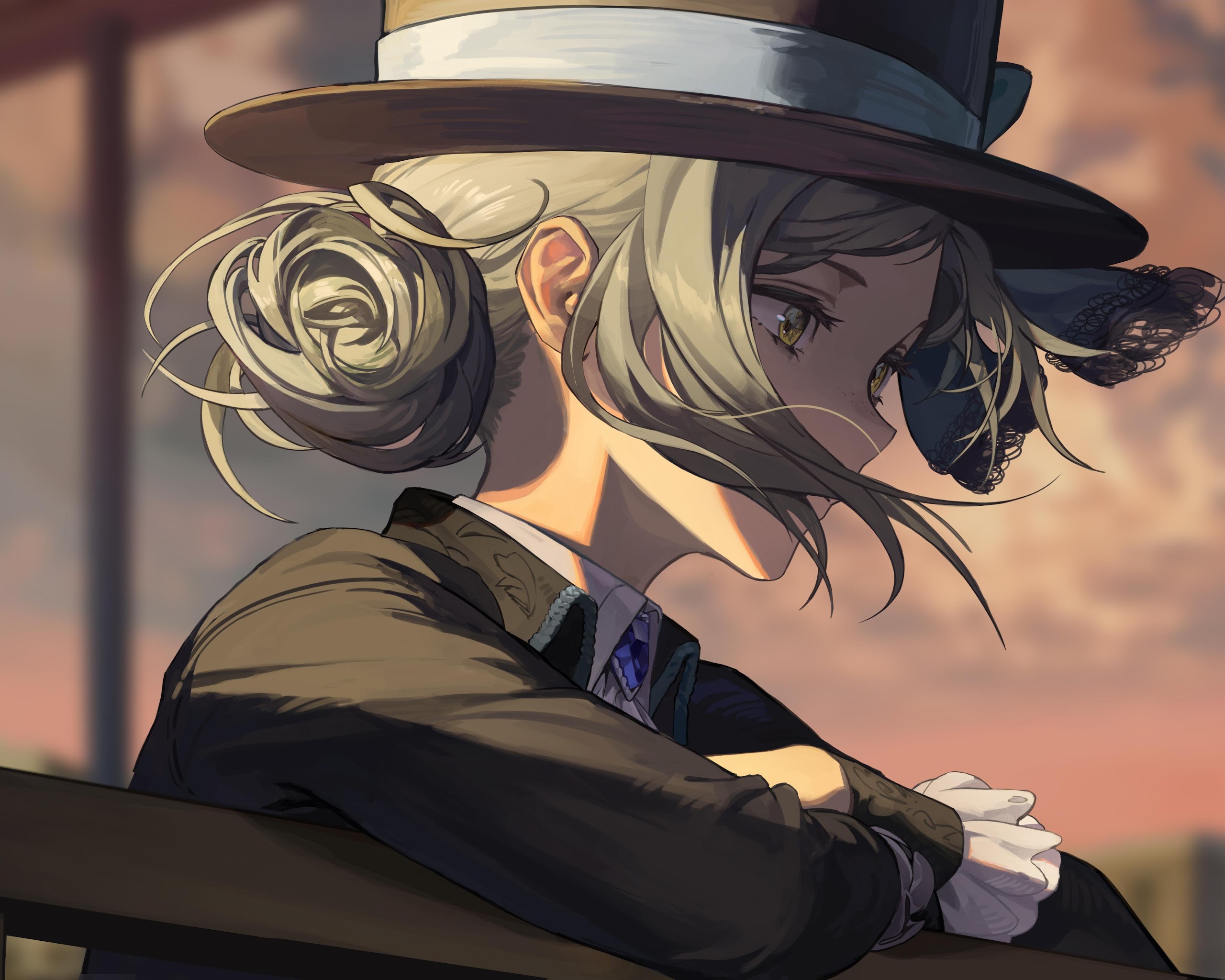 Anime Girls, Silver Hair, Hat, Looking Away, Sunset 5K Desktop Wallpaper