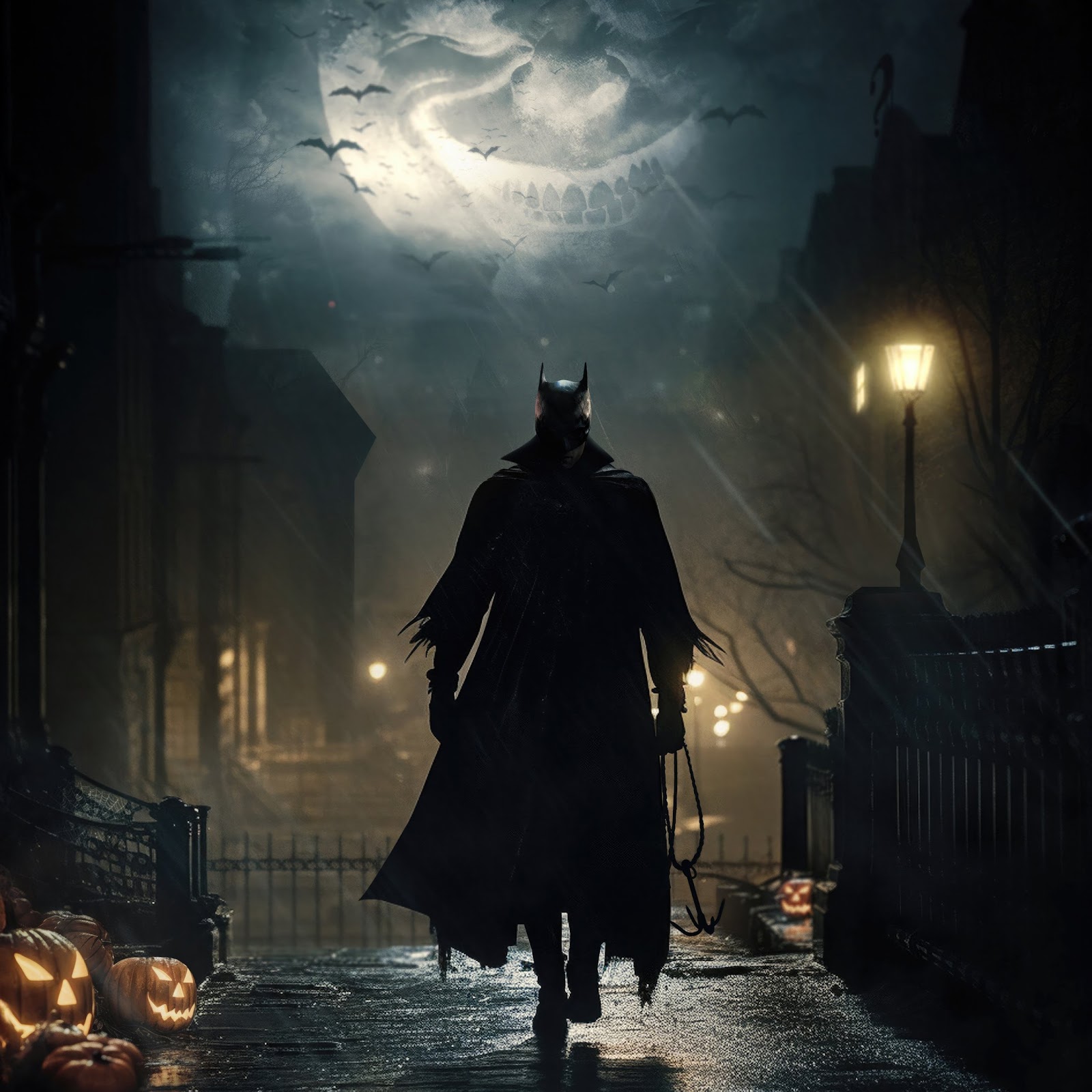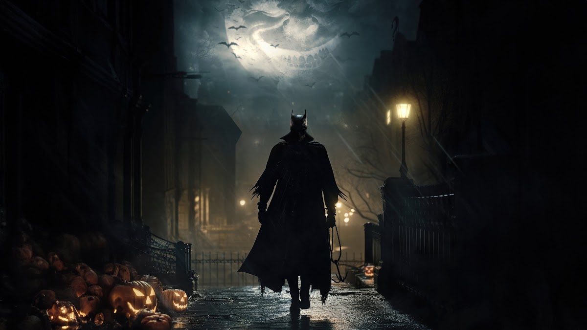 Batman, Halloween, Gotham, Night 4K Desktop Wallpaper Background with a maximum resolution of 3840x2160 px.