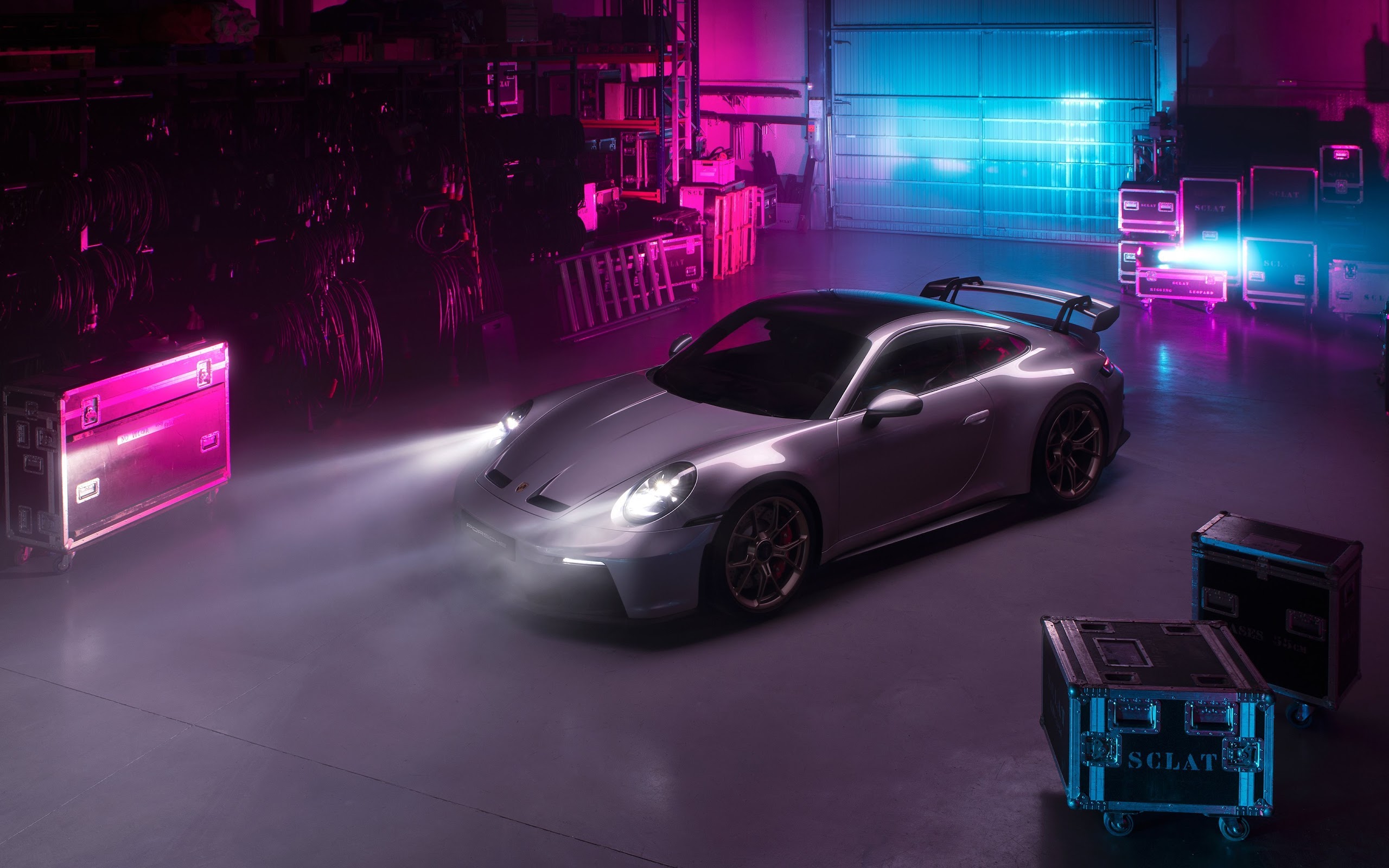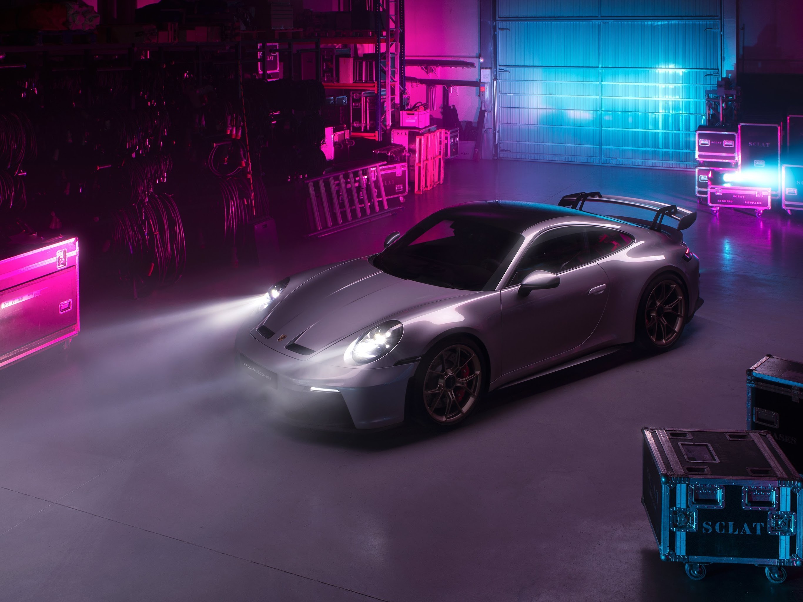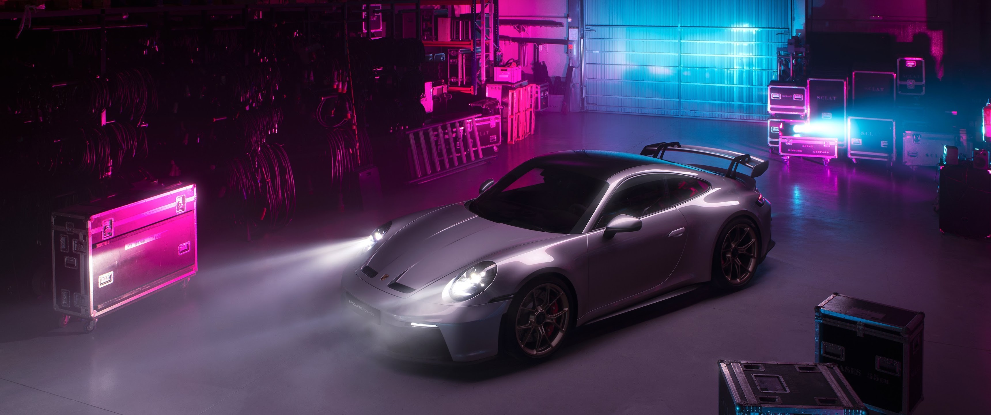Porsche, Gt3, Silver, Neon, Warehouse 4K Desktop and Mobile Wallpaper Background with a maximum resolution of 3840x2160 px.